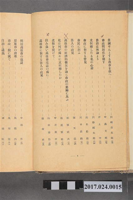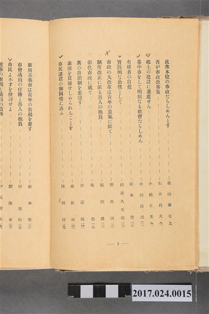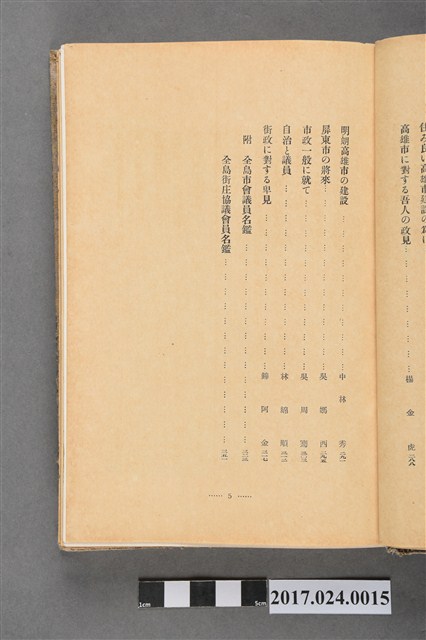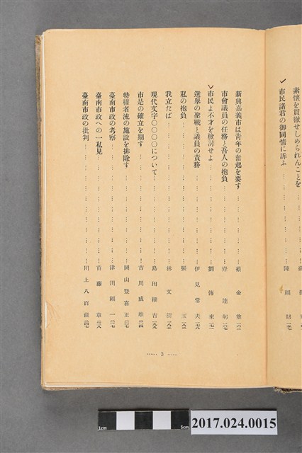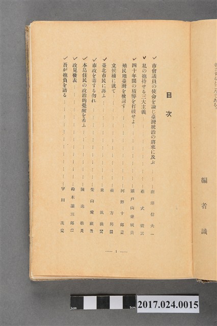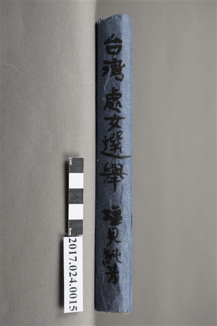 本文物是塩見純芳編的《臺湾處女選舉言論戰》,成書於昭和11年(1936年),由臺灣辯論研究會發行,印刷所為臺灣日日新報社臺南支局,該書內容論述的主題是關於臺灣婦女選舉的議題,由各方言論文章所編集而成。各文章作者有臺日籍人士,日籍人士如唐澤信夫一、瀨戶山兼斌、河野十郎,知名臺籍人士如律師蔡式穀、陳逸松。(撰稿人:曾國棟,陳怡宏校正)