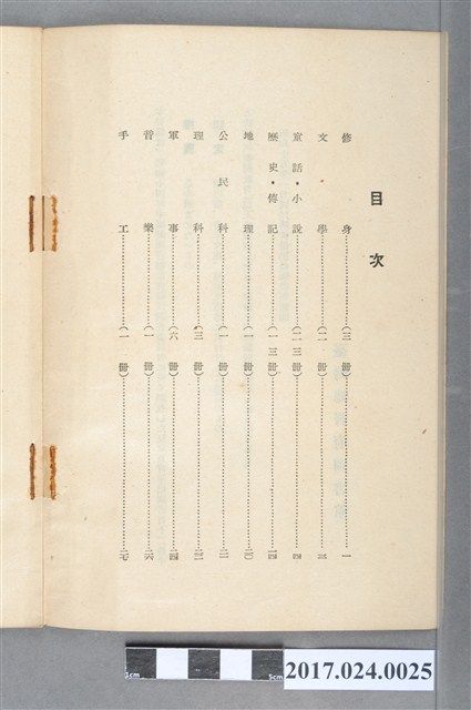 此文物為昭和14年推薦選定圖書目錄,此目錄為昭和14年臺灣圖書館協會圖書調查委員會,調查的兒童及青年用的圖書中的一百二十本書中,推薦的書冊包括圖書館、青年文庫、兒童文庫等,及臺灣教育誌上發表的五十四冊。類型包含:修身、文學、童話小說、歷史傳記、地理、公民科、理科、軍事、音樂、手工等。(撰稿人:曾國棟)