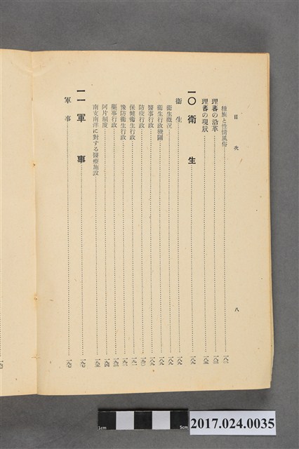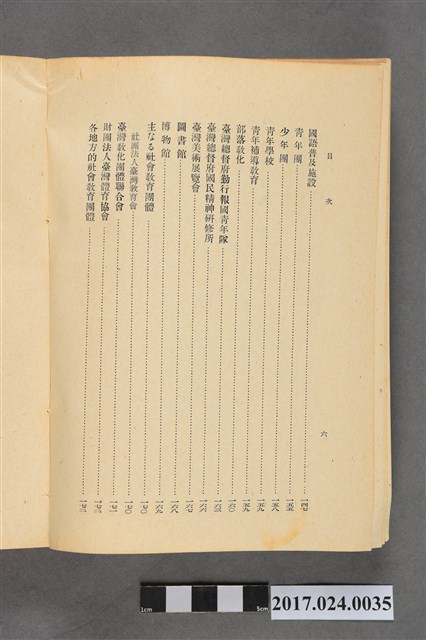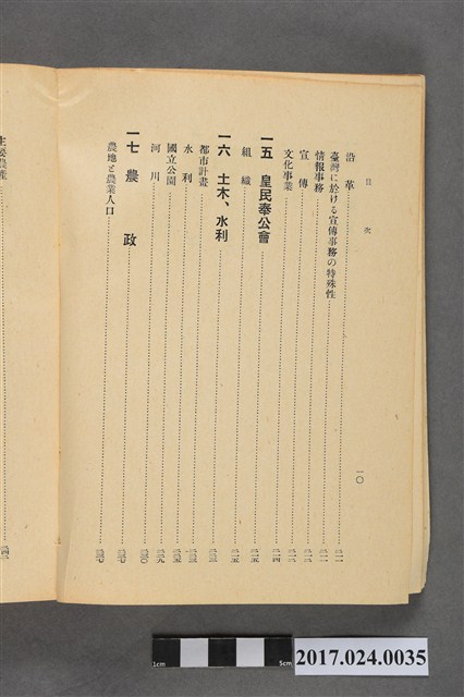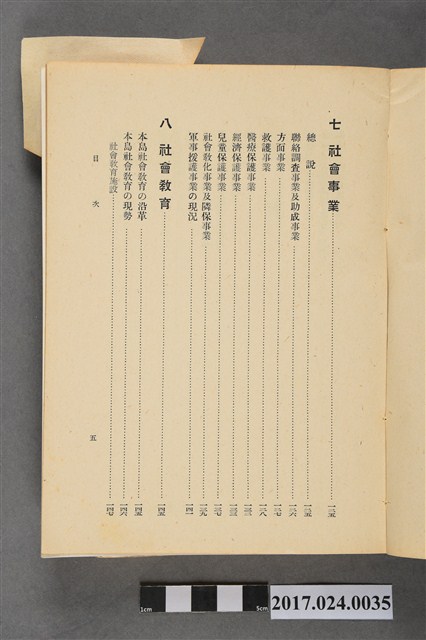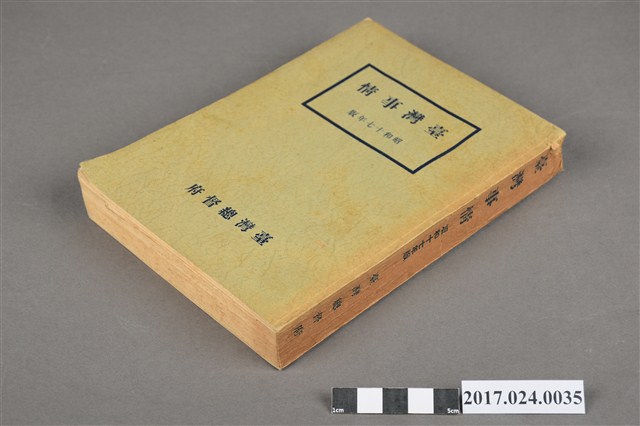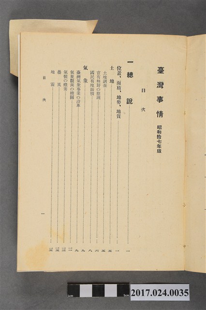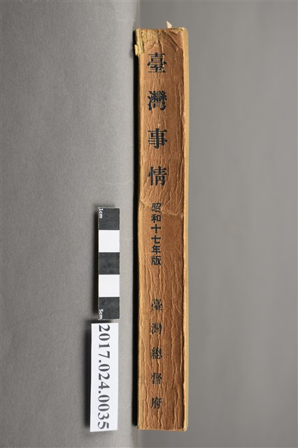 此文物為書籍臺灣事情,此書為昭和17年版本,由臺灣總督府情報部發行,內容介紹臺灣土地、氣候、行政、財政、司法、教育、神社及宗教、社會事業、社會教育、警察等重要臺灣建設,另外有臺灣各地重要設施景點照片。(撰稿人:曾國棟)