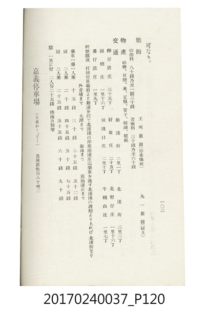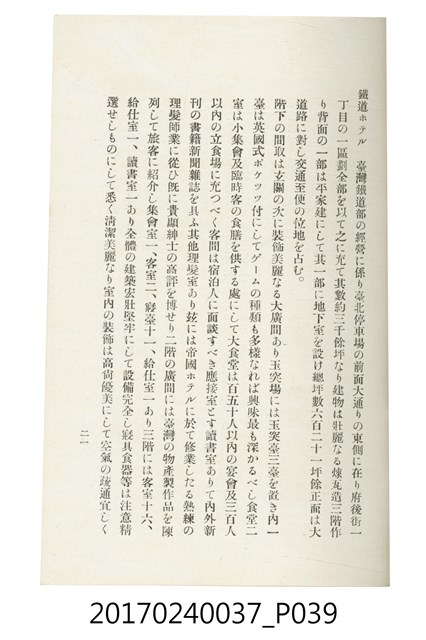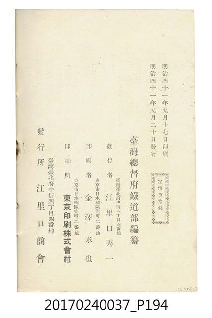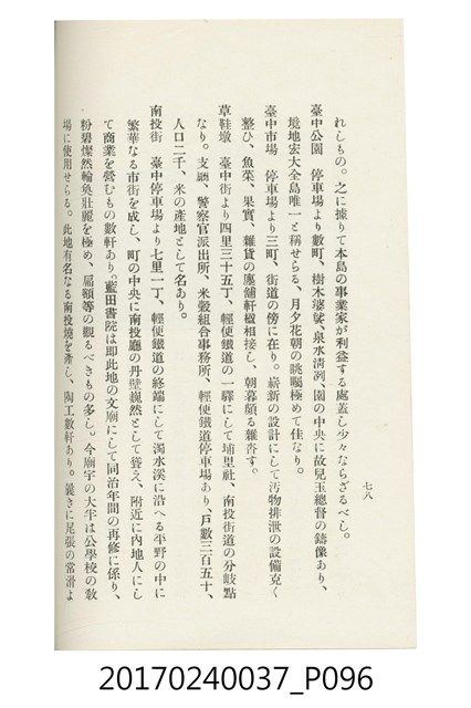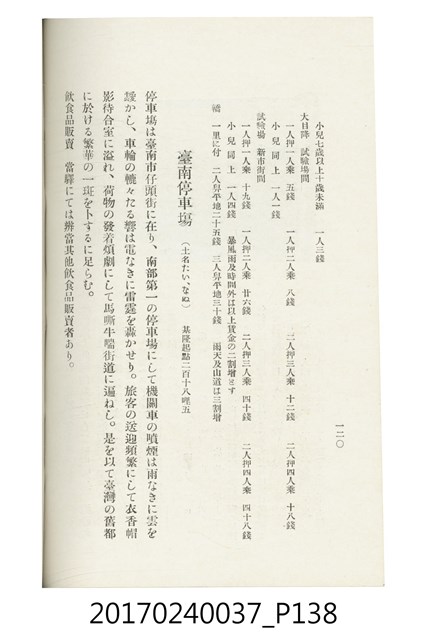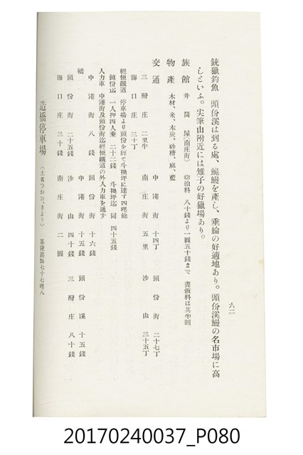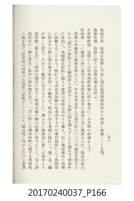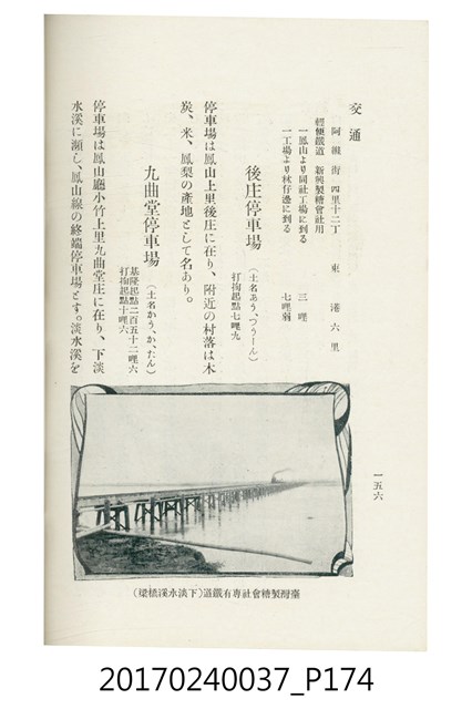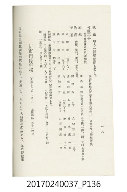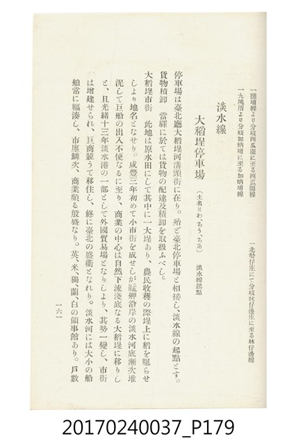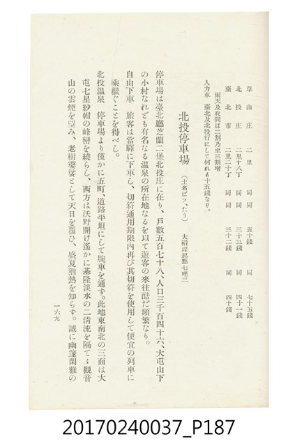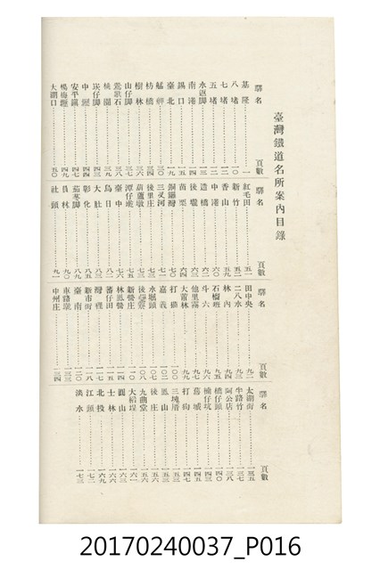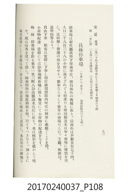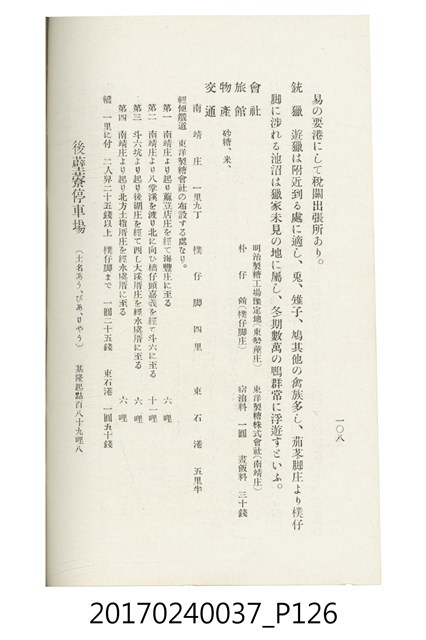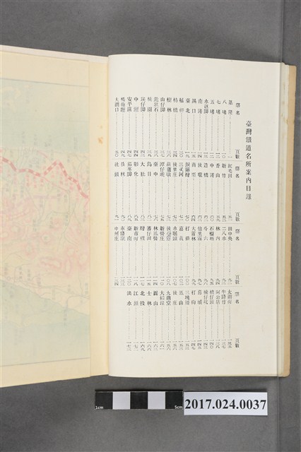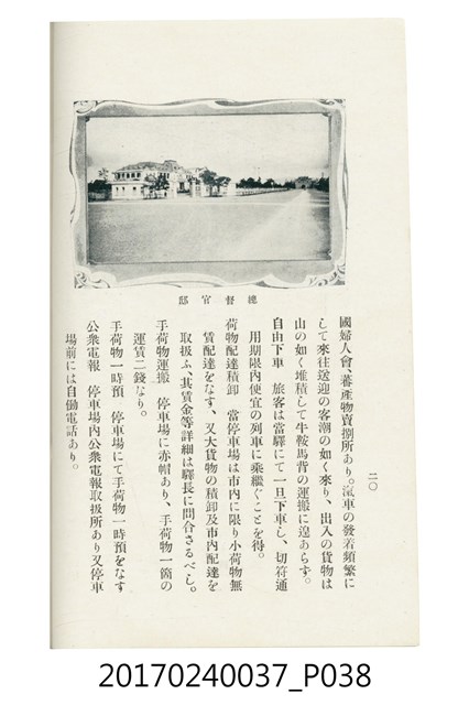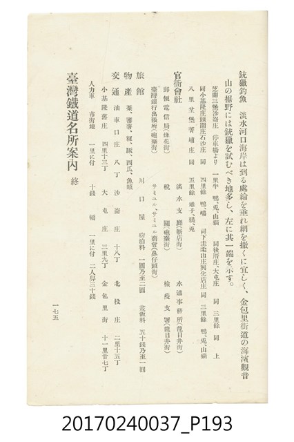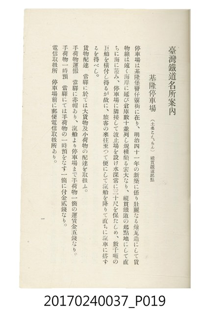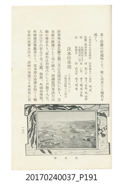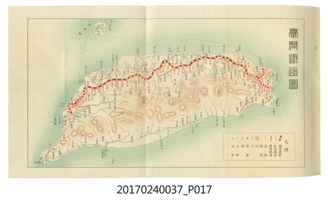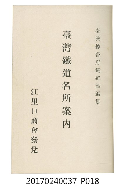 本文物為臺灣總督府鐵道部編的《臺灣鐵道名勝指南》,明治41年(1908年)發行,列出火車站名,基隆、八堵、七堵、五堵、永返腳、南港、錫口、臺北、艋舺、枋橋、樹林、山仔腳、鶯歌石、桃園、崁仔腳、中壢、安平鎮、楊梅壢、大湖口、紅毛田、新竹、香山、中港、造橋、後壠、苗栗、銅鑼灣、三叉河、後里庄、葫蘆墩、潭仔墘、臺中、烏日、大肚、彰化、茄苳腳、員林、社頭、田中央、二八水、林內、石榴班、斗六、他里霧、大菁林、打貓、嘉義、水堀頭、後?藔、新營庄、林鳳營、蕃仔田、灣裡、新市街、臺南、車路墘、中洲庄、太湖街、半路竹、阿公