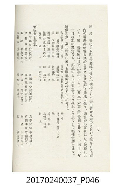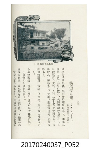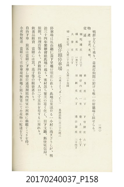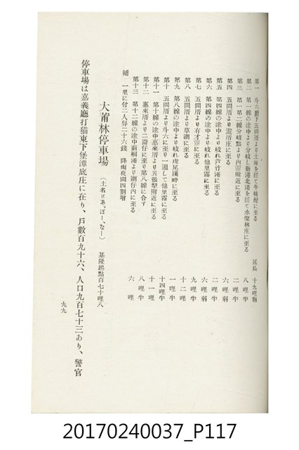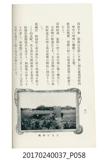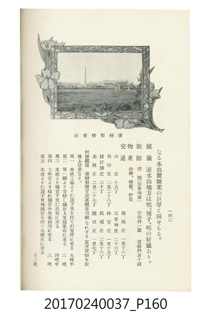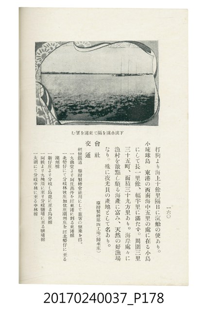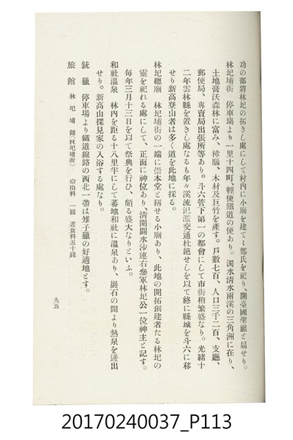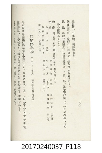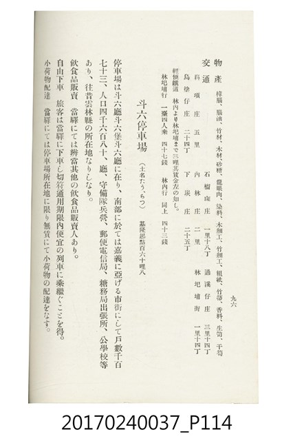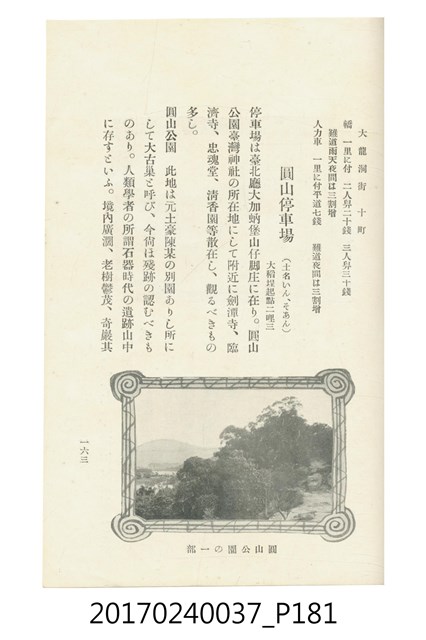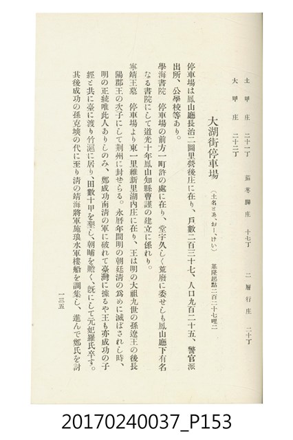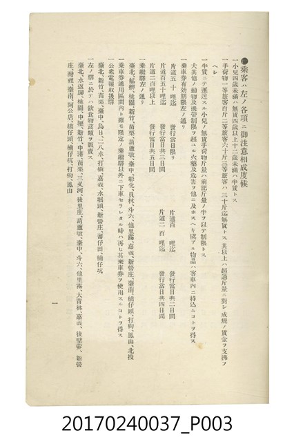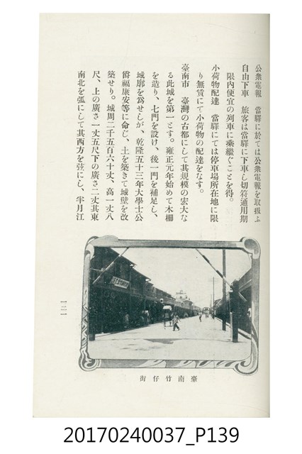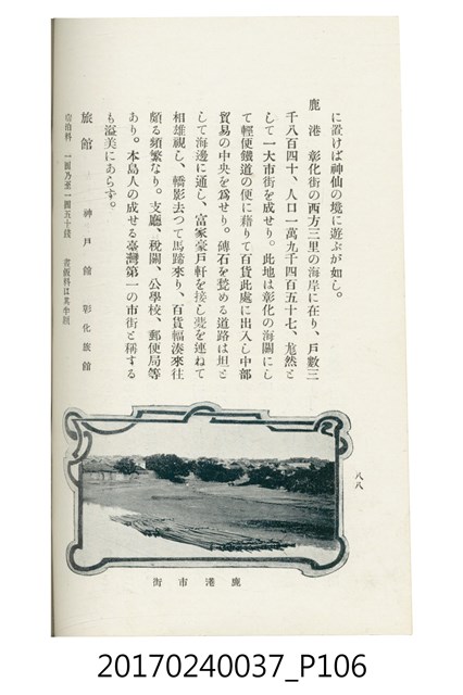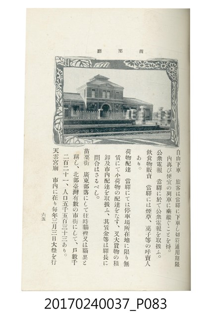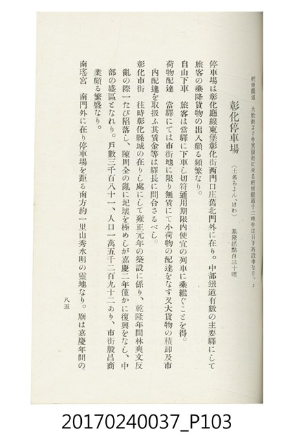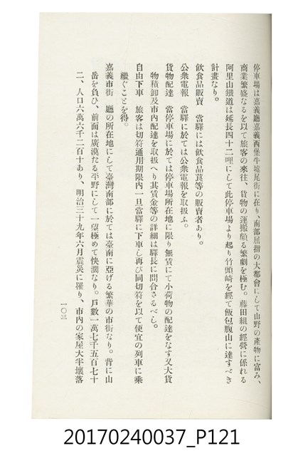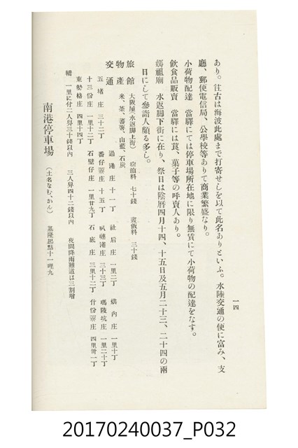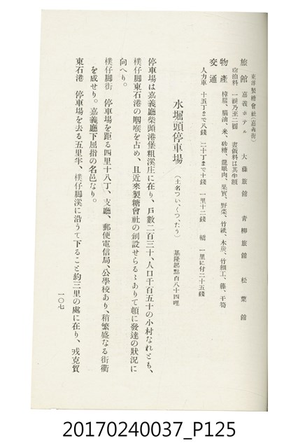本文物為臺灣總督府鐵道部編的《臺灣鐵道名勝指南》,明治41年(1908年)發行,列出火車站名,基隆、八堵、七堵、五堵、永返腳、南港、錫口、臺北、艋舺、枋橋、樹林、山仔腳、鶯歌石、桃園、崁仔腳、中壢、安平鎮、楊梅壢、大湖口、紅毛田、新竹、香山、中港、造橋、後壠、苗栗、銅鑼灣、三叉河、後里庄、葫蘆墩、潭仔墘、臺中、烏日、大肚、彰化、茄苳腳、員林、社頭、田中央、二八水、林內、石榴班、斗六、他里霧、大菁林、打貓、嘉義、水堀頭、後?藔、新營庄、林鳳營、蕃仔田、灣裡、新市街、臺南、車路墘、中洲庄、太湖街、半路竹、阿公