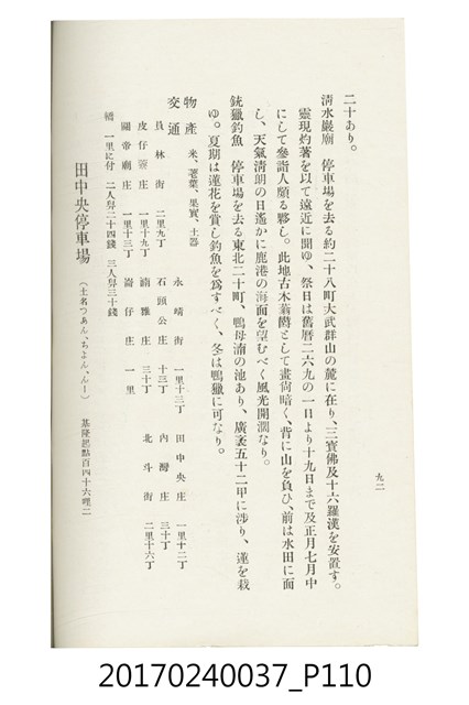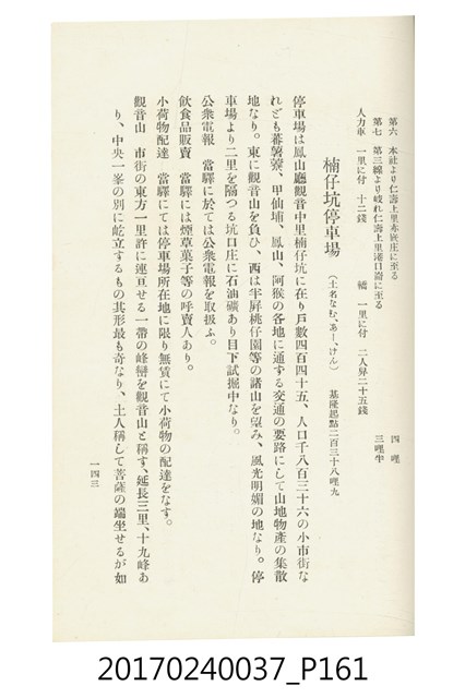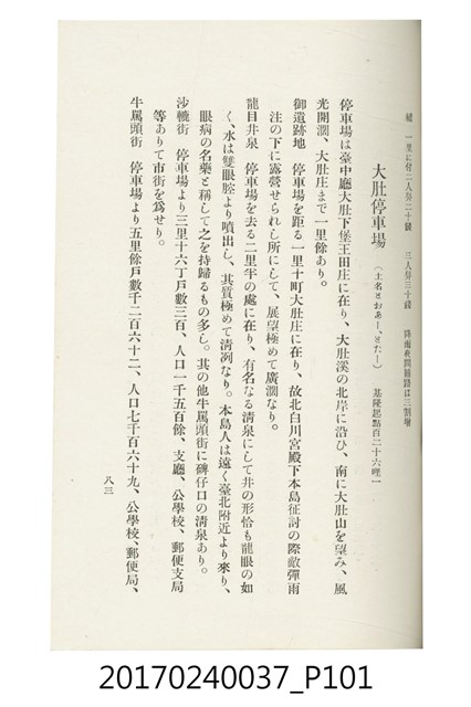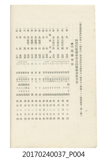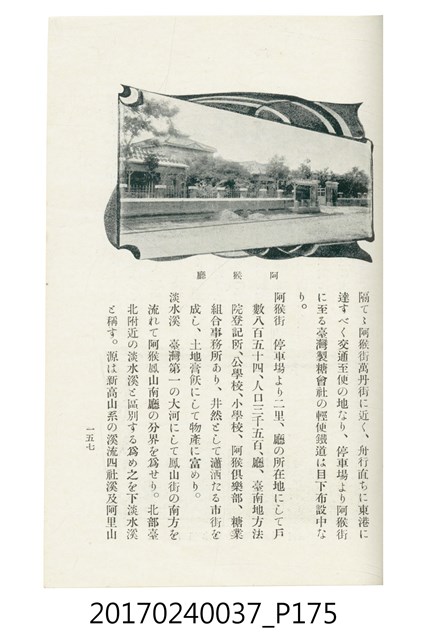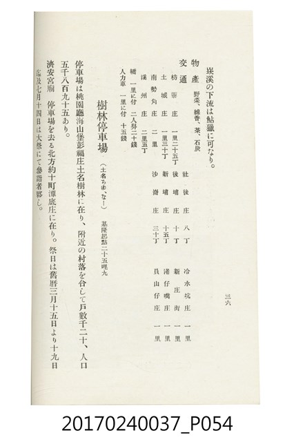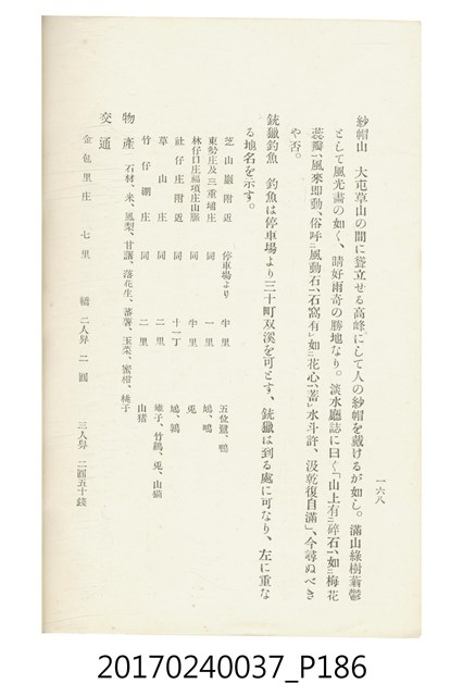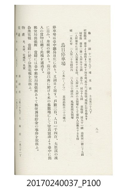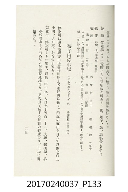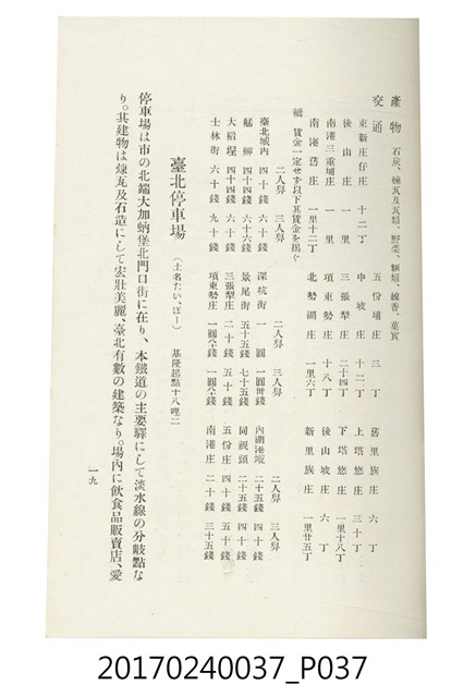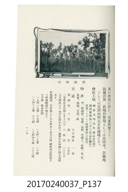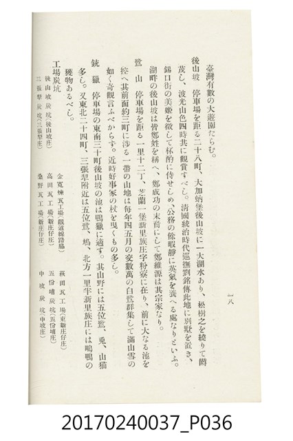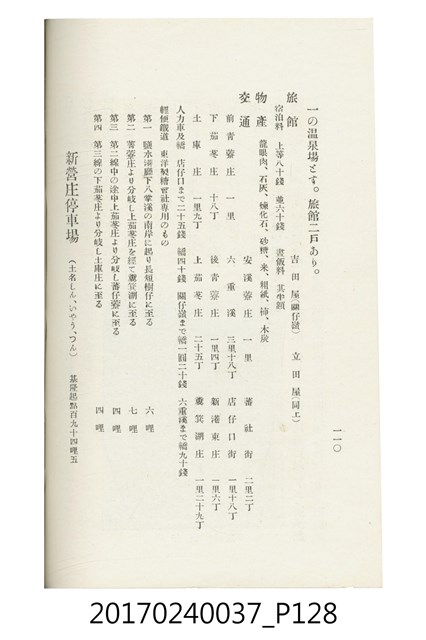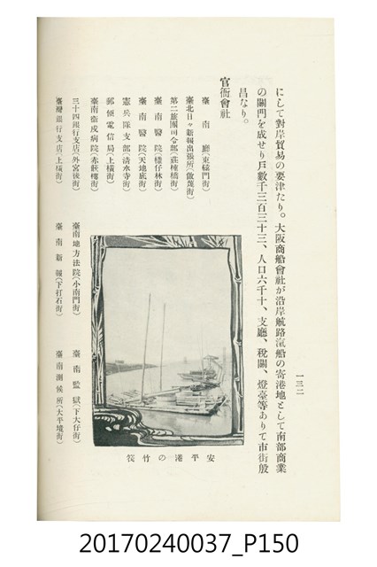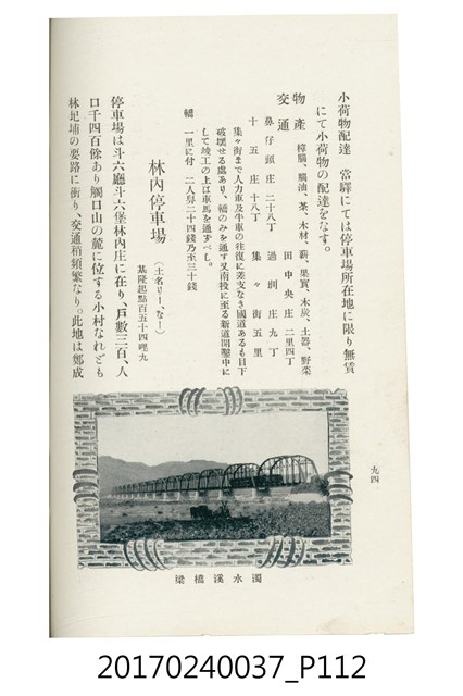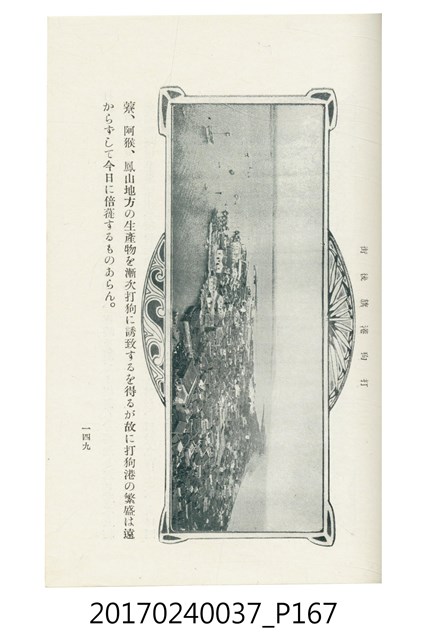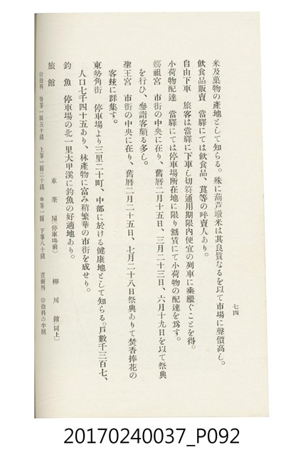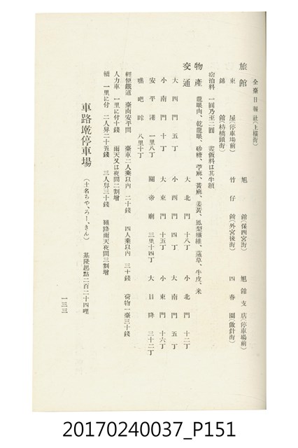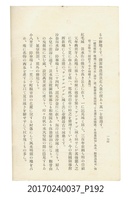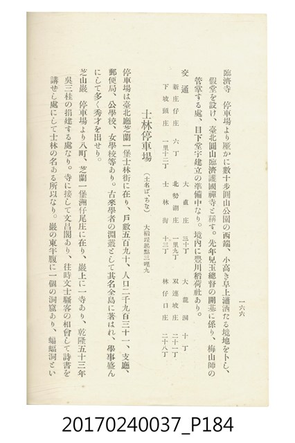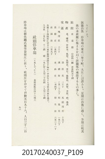 本文物為臺灣總督府鐵道部編的《臺灣鐵道名勝指南》,明治41年(1908年)發行,列出火車站名,基隆、八堵、七堵、五堵、永返腳、南港、錫口、臺北、艋舺、枋橋、樹林、山仔腳、鶯歌石、桃園、崁仔腳、中壢、安平鎮、楊梅壢、大湖口、紅毛田、新竹、香山、中港、造橋、後壠、苗栗、銅鑼灣、三叉河、後里庄、葫蘆墩、潭仔墘、臺中、烏日、大肚、彰化、茄苳腳、員林、社頭、田中央、二八水、林內、石榴班、斗六、他里霧、大菁林、打貓、嘉義、水堀頭、後?藔、新營庄、林鳳營、蕃仔田、灣裡、新市街、臺南、車路墘、中洲庄、太湖街、半路竹、阿公