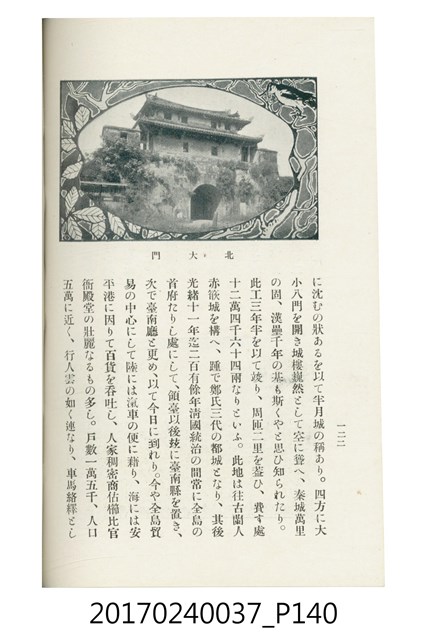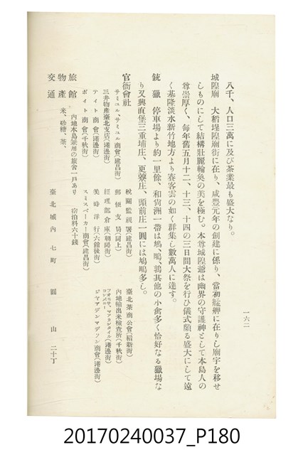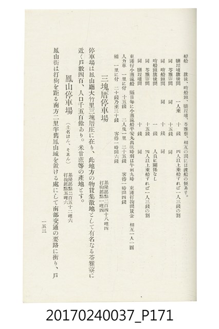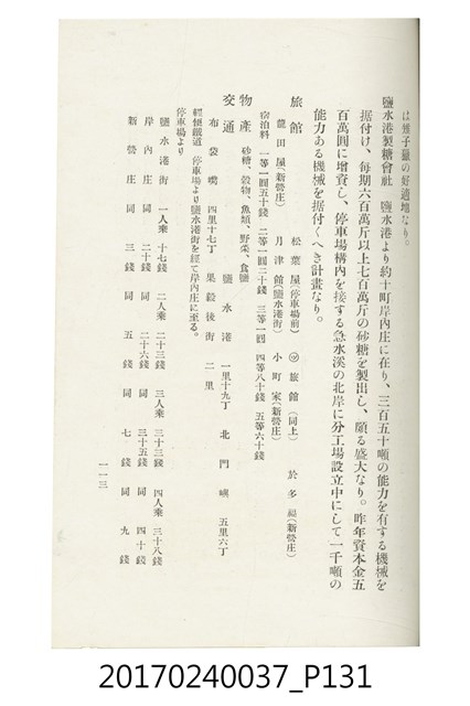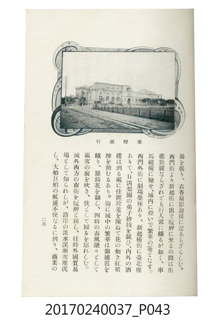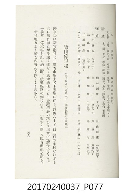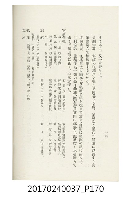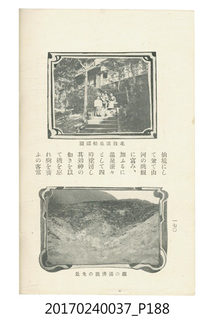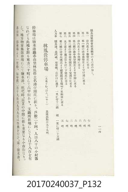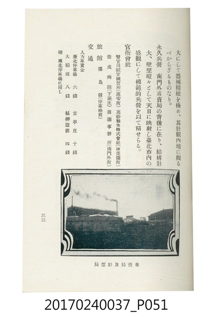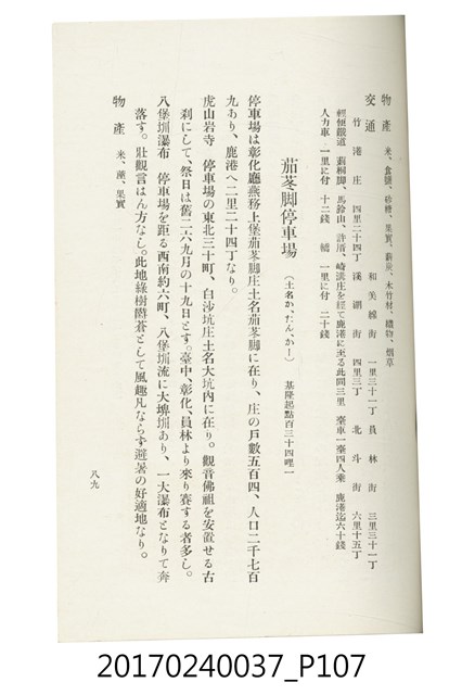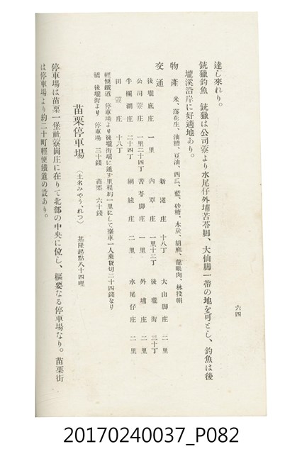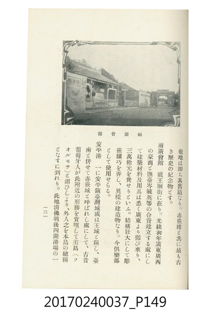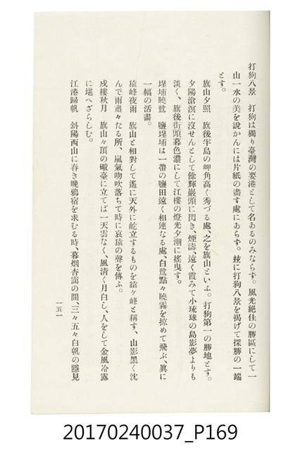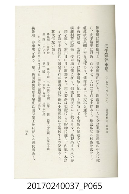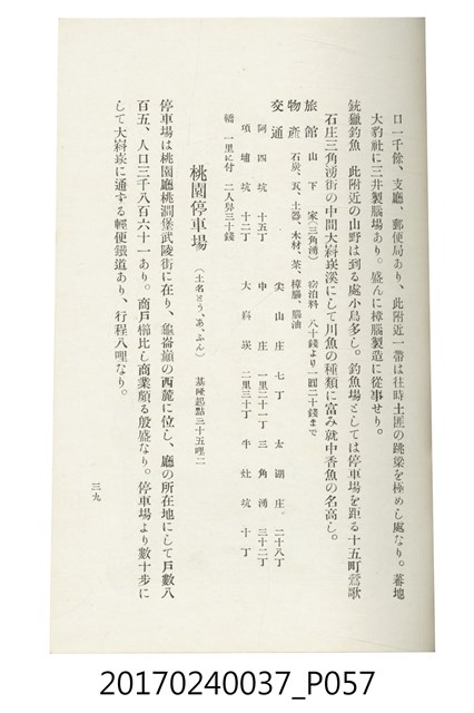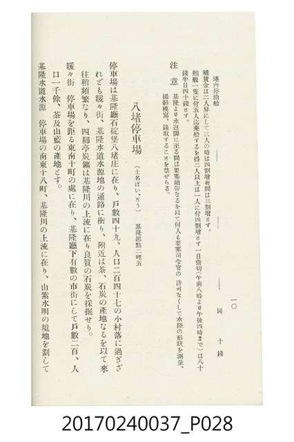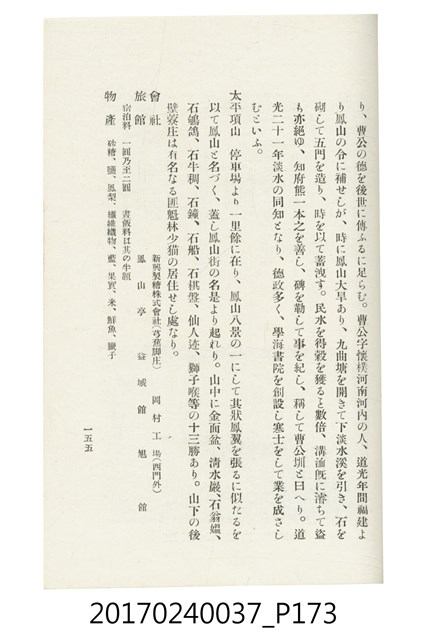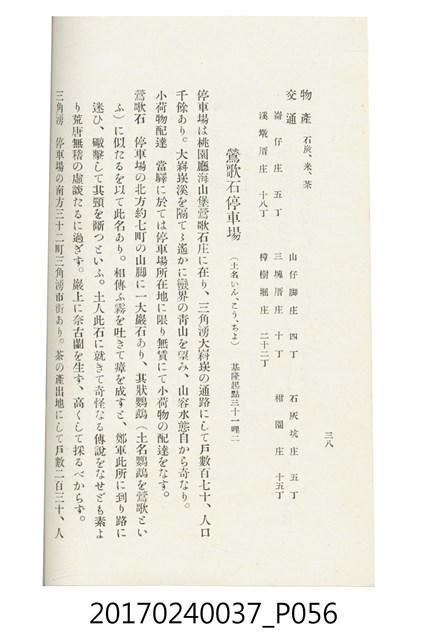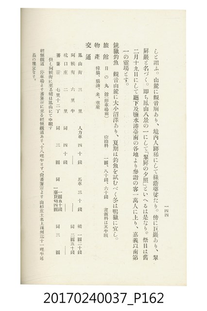 本文物為臺灣總督府鐵道部編的《臺灣鐵道名勝指南》,明治41年(1908年)發行,列出火車站名,基隆、八堵、七堵、五堵、永返腳、南港、錫口、臺北、艋舺、枋橋、樹林、山仔腳、鶯歌石、桃園、崁仔腳、中壢、安平鎮、楊梅壢、大湖口、紅毛田、新竹、香山、中港、造橋、後壠、苗栗、銅鑼灣、三叉河、後里庄、葫蘆墩、潭仔墘、臺中、烏日、大肚、彰化、茄苳腳、員林、社頭、田中央、二八水、林內、石榴班、斗六、他里霧、大菁林、打貓、嘉義、水堀頭、後?藔、新營庄、林鳳營、蕃仔田、灣裡、新市街、臺南、車路墘、中洲庄、太湖街、半路竹、阿公