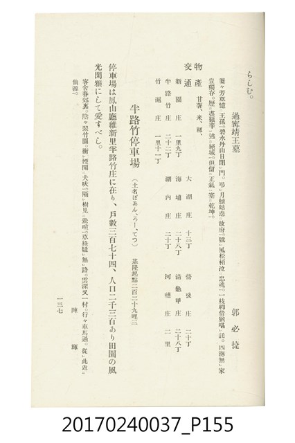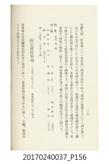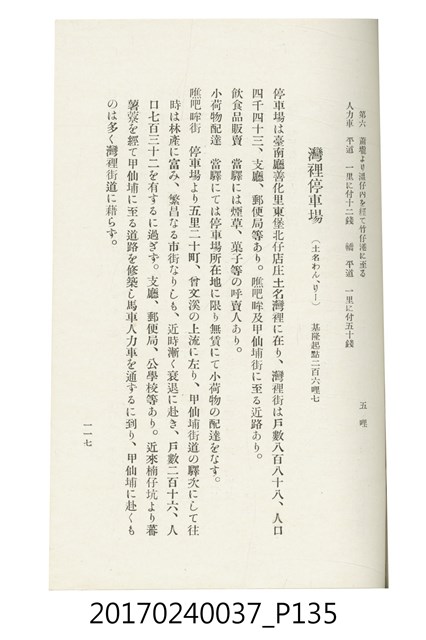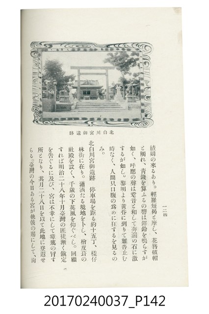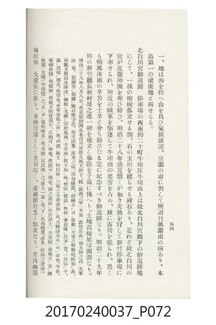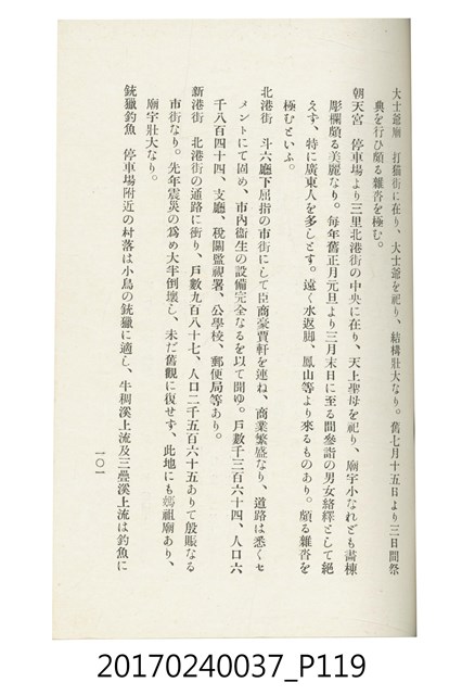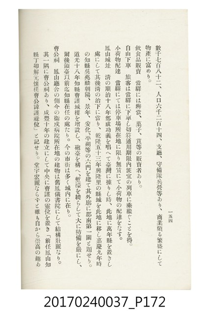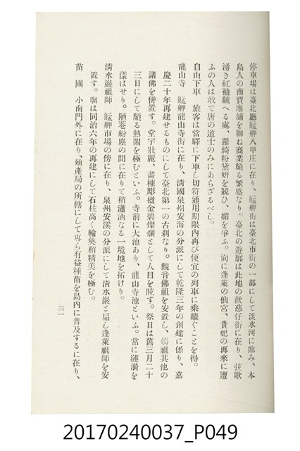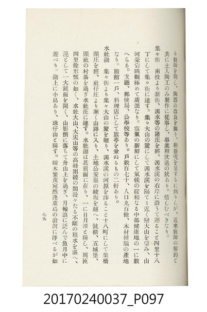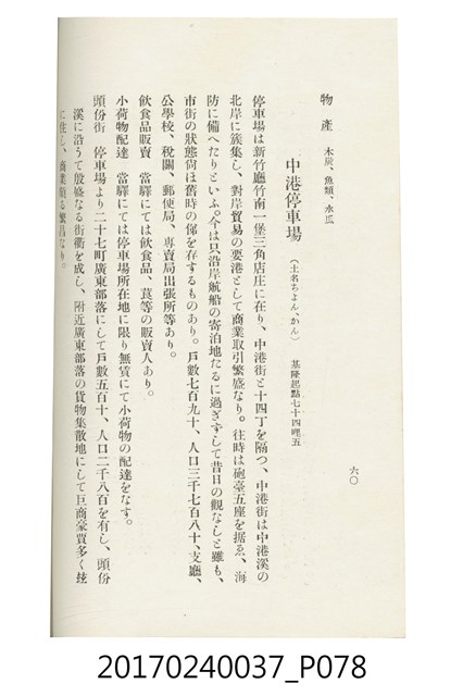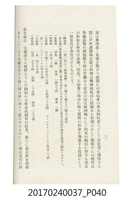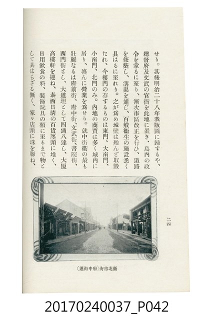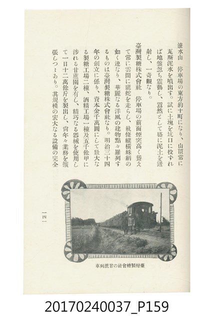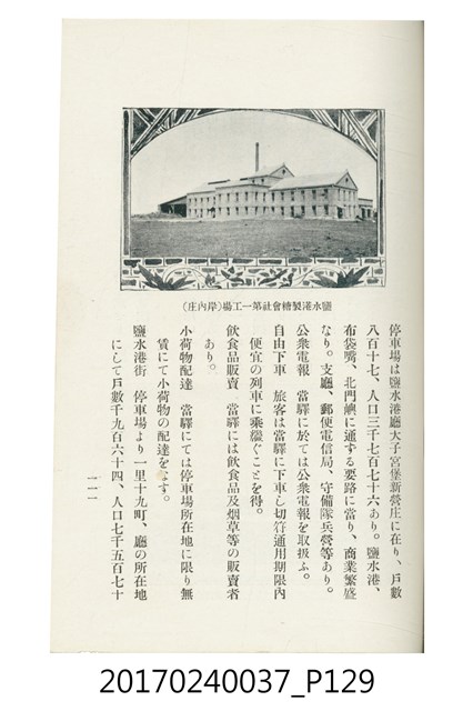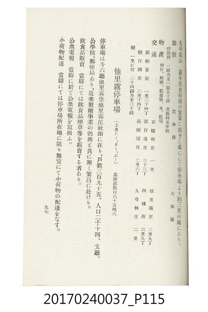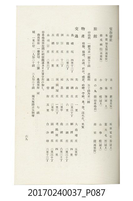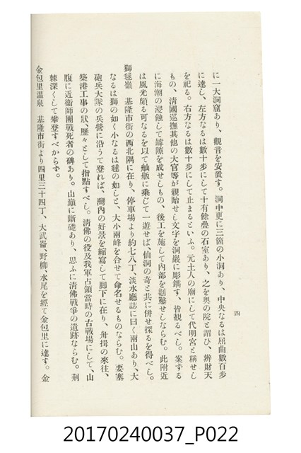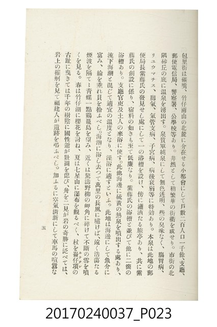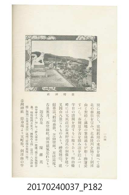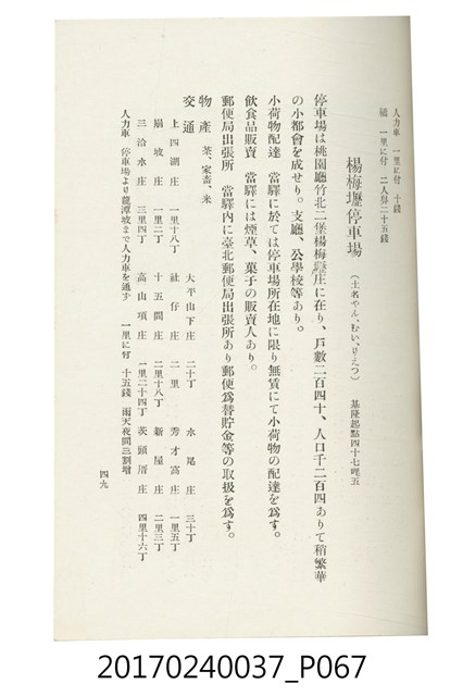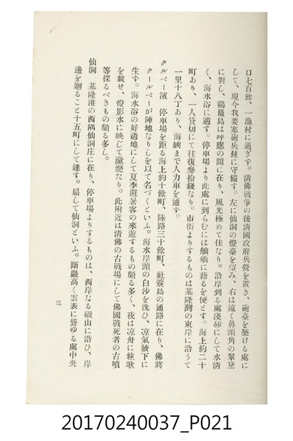 本文物為臺灣總督府鐵道部編的《臺灣鐵道名勝指南》,明治41年(1908年)發行,列出火車站名,基隆、八堵、七堵、五堵、永返腳、南港、錫口、臺北、艋舺、枋橋、樹林、山仔腳、鶯歌石、桃園、崁仔腳、中壢、安平鎮、楊梅壢、大湖口、紅毛田、新竹、香山、中港、造橋、後壠、苗栗、銅鑼灣、三叉河、後里庄、葫蘆墩、潭仔墘、臺中、烏日、大肚、彰化、茄苳腳、員林、社頭、田中央、二八水、林內、石榴班、斗六、他里霧、大菁林、打貓、嘉義、水堀頭、後?藔、新營庄、林鳳營、蕃仔田、灣裡、新市街、臺南、車路墘、中洲庄、太湖街、半路竹、阿公