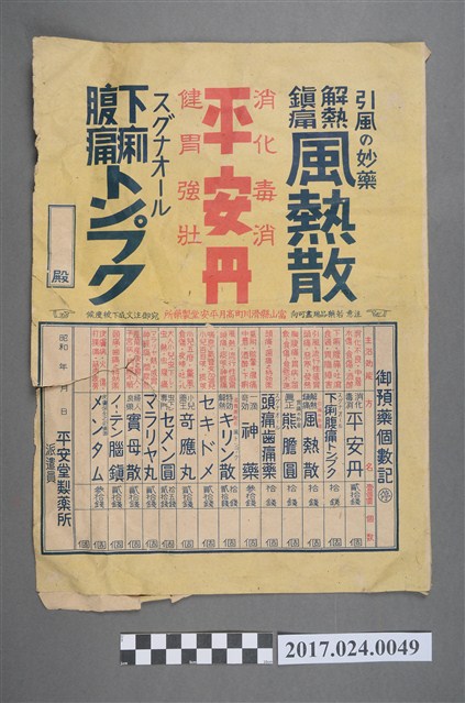 2017.024.0049 平安堂製藥所家庭常備平安丹平安單寄藥包