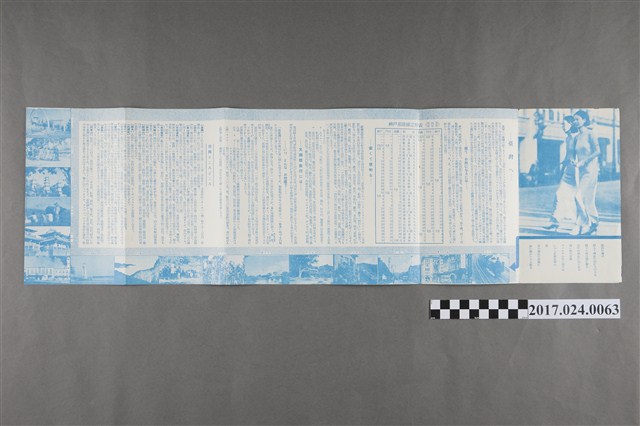 此文物封面標題為「臺灣へ」最下面印著「臺灣總督府交通局鐵道部」,封面圖案為一隻水牛在耕種,還有一隻白鷺鷥在飛行,主要用色為黃色和綠色。內頁有神戶基隆線定期表、臺灣一週遊覽日程費用概算、臺灣遊覽略圖還有介紹臺灣的一些景點。(撰稿人:曾國棟)