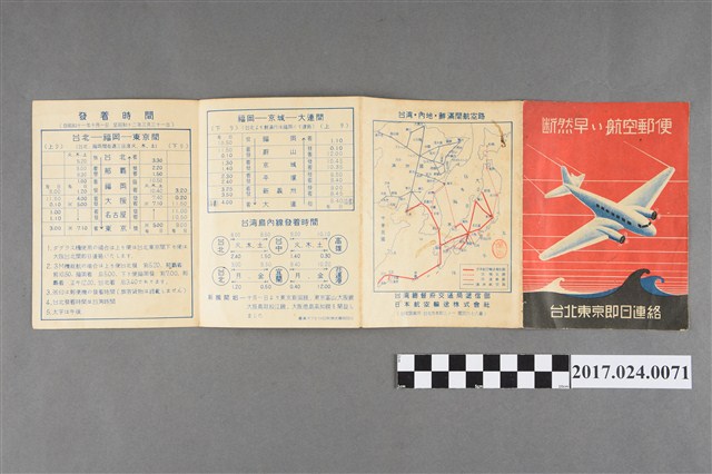 此文物為絕對快航空郵寄宣傳品,封面標題為「斷然早ぃ航空郵便 臺北東京即日聯絡」,封面為紅色背景,中間有一架飛機。內頁有介紹郵寄、說明郵寄價錢、出發時間、重量限制說明及旅客運貸價錢等資訊。(撰稿人:曾國棟)