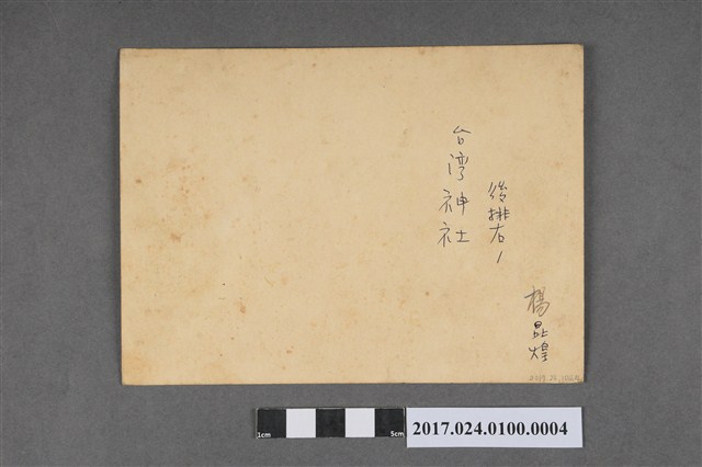 本文物為日治時期之相片,照片中共有14人,右側站有3名女性。楊昆煌等人穿著正裝站在鳥居下方拍照,後方景色由樓梯延伸至神社及後方的山頭。照片背面寫有「楊昆煌」、「後排右1」、「臺湾神社」,並帶有黃色斑點。(撰稿人:曾國棟)
