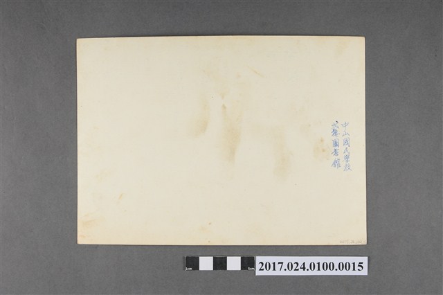 本文物拍攝於民國54年(1965),照片共51人,坐於前排中央,頭髮斑白的為楊昆煌先生。參與拍攝者皆為男性,照片最左側一名學生身旁站著一男童。人像背景掛有國旗及國父遺像。照片下方以白字寫有「彰一公卅三期同學會 民國五四年三月七日」,背面寫有「中山國民學校弍樓圖書館」。(撰稿人:曾國棟)