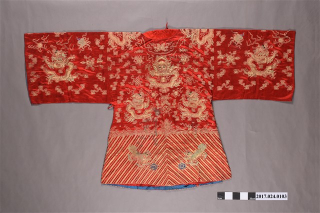 此文物傳為新豐庄徐慶瀾舉人宅清代新娘服,整件為緞布紅色,從手臂到下擺皆有用金黃色的細線繡製一些花紋,主要圖案為龍的圖樣,內裡的布料為藍色。出嫁當日,新娘梳頭插簪、戴上鳳冠,於禮服內穿著白色衫、裙(褲)以表示貞節。此套貼身衣裙通常會延請有福氣(福壽雙全)的婦人製作,在結婚當日穿過後即收藏起來,等到老年以後再穿於壽衣底層,取其(貞節)有始有終之意。