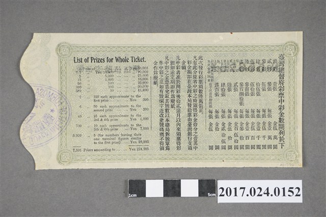 本文物為臺灣總督府彩票局第肆次發行的彩票,為綠色紙質,中英文書寫,在右側邊緣呈波浪狀,並蓋有一戳印,此次總共發行60000張彩票。此張編號為NO.55675,其價格為50錢,其下方的開獎日期為明治40年(1907年)3月13日於臺北開獎;背面則有寫有相關獎金制度。 臺灣社會賭博風氣極盛,沉迷於「花會」這類的賭博活動中,而荒廢正當工作,明治30年(1897年)總督府便透過保甲制度進行取締,而賭客轉向購買菲律賓等地的彩票,造成國內資金大量流往外國;而同時,也因日治初期,治理臺灣