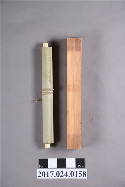 本文物為臺北舊城秋山春水卷軸掛畫收納盒,收納盒上面寫臺北舊城秋山春水帝展、臺展畫家。另外寫有此掛畫之年代為大正14年(1925年)。卷軸掛畫中描繪一戴斗笠之農夫在舊臺北城門前趕兩隻水牛。(撰稿人:曾國棟)是否為秋山春水畫作,後續如有更確切考究,將補相關資料(陳怡宏校正)。
