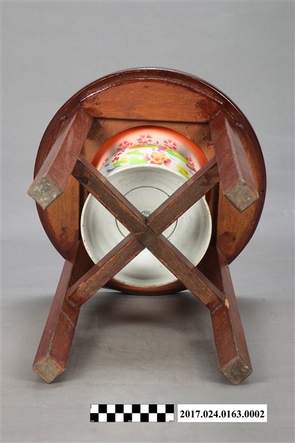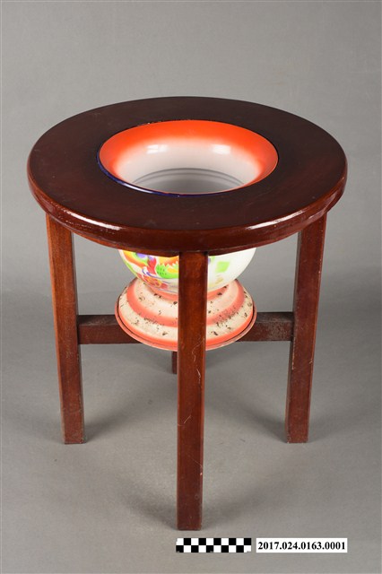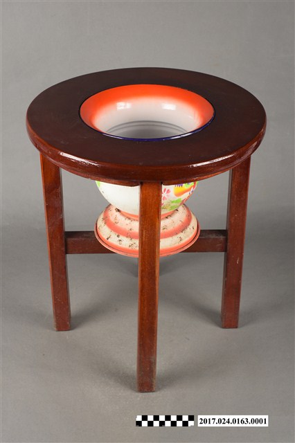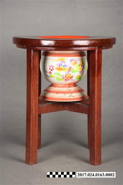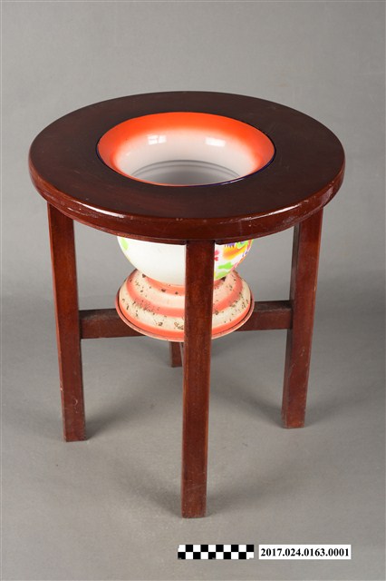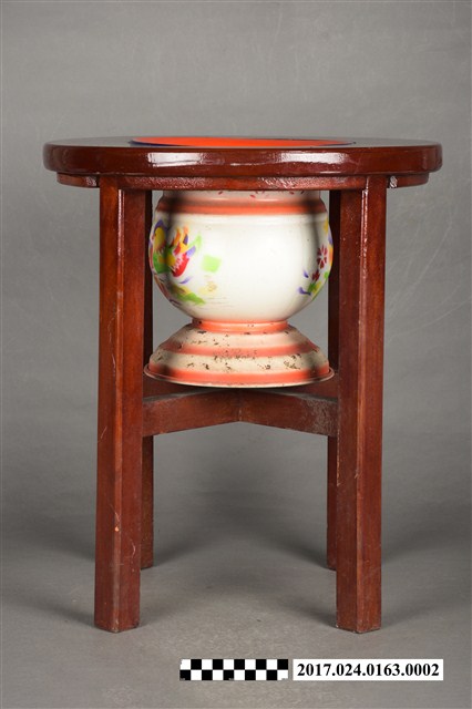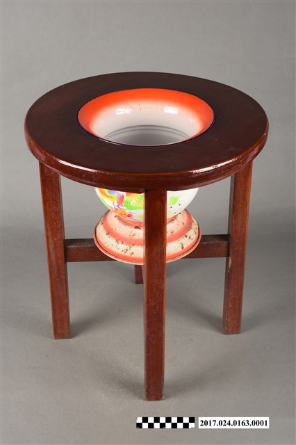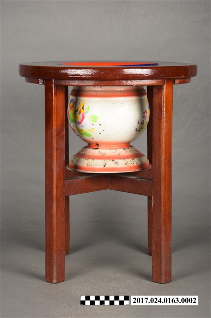 一張小圓木桌鑲著一個瓶子,瓶子上有著彩色的小雞圖案和一些花紋,瓶子底部有些髒汙。