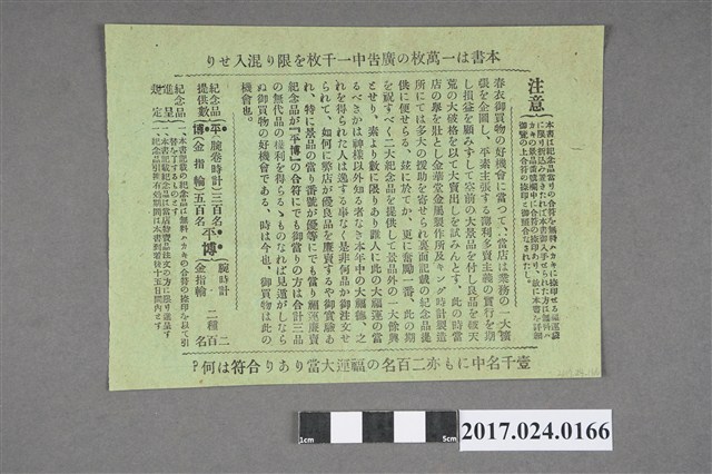本文物為大正11年(1922年)3月10日開始舉辦之平和紀念東京博覽會抽獎劵,以黑白印刷印製在綠色的紙上,以日文書寫。其紀念贈品為「腕卷裝飾時計」及「美術雕刻的金指輪」兩種,同時在背面也記載了其紀念品提供之數量及相關注意事項。 平和紀念東京博覽會,東京府於大正11年(1922年)3月10日至7月31日,於東京上野舉辦,其目的為紀念一次大戰後的和平,而臺灣也參與展覽之中,臺灣館的位置於第二會場不忍池旁,展出臺灣相關之特色及產品,最後臺灣館的銷售額僅次於東京府,獲得第二位。(