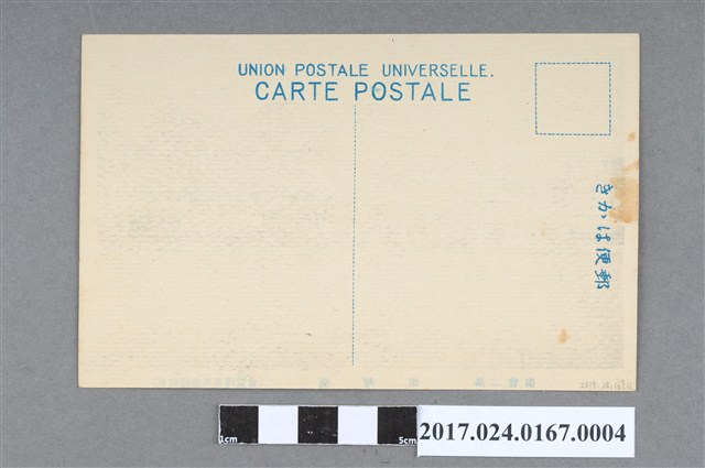本文物為一日治時期黑白印製的明信片。其內容為平和紀念東京博覽會第二會場臺灣館外觀,在其正面的右上角,蓋有一章,上寫有「平和紀念東京博覽會」的字樣,中間則有一鴿子與鐘,並寫有「和平」二字;其背面,右側寫有「郵便はかき」,上方則有「UNION POSTALE UNIVERSELLE. CARTE POSTALE」等字樣。 平和紀念東京博覽會,東京府於大正11年(1922年)3月10日至7月31日,於東京上野舉辦,其目的為紀念一次大戰後的和平,而臺灣也參與展覽之中,臺灣館的