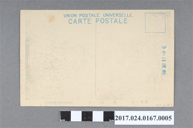 本文物為一日治時期黑白印製的明信片。其內容為平和紀念東京博覽會第一會場平和館外觀,而其前方水池聚集了許多日本民眾到場。在其正面的右上角,蓋有一章,上寫有「平和紀念東京博覽會」的字樣,中間則有一鴿子與鐘,並寫有「和平」二字;其背面,右側寫有「郵便はかき」,上方則有「UNION POSTALE UNIVERSELLE. CARTE POSTALE」等字樣。
