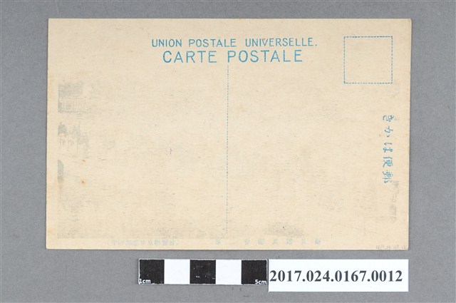 本文物為一日治時期黑白印製的明信片。其內容為平和紀念東京博覽會第二會場及觀月橋的外觀,而橋上也聚集了許多日本民眾到場參觀。在其正面的右上角,蓋有一章,上寫有「平和紀念東京博覽會」的字樣,中間則有一鴿子與鐘,並寫有「和平」二字;其背面,右側寫有「郵便はかき」,上方則有「UNION POSTALE UNIVERSELLE. CARTE POSTALE」等字樣。 平和紀念東京博覽會,東京府於大正11年(1922年)3月10日至7月31日,於東京上野舉辦,其目的為紀念一次大戰