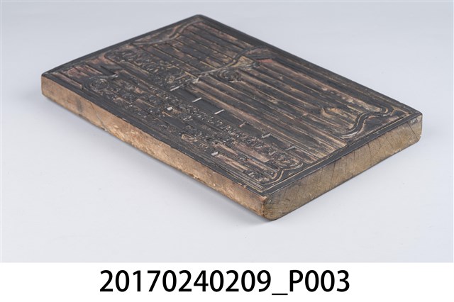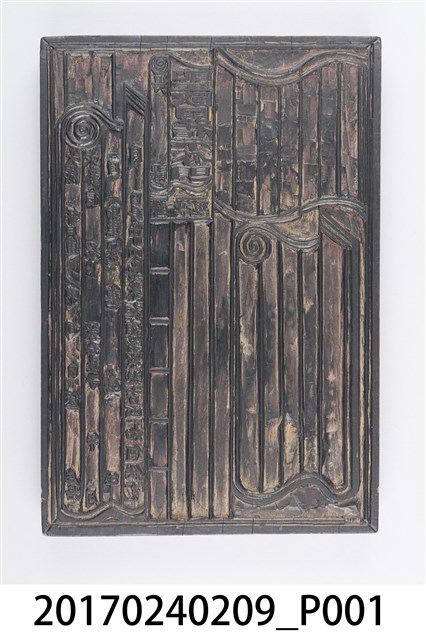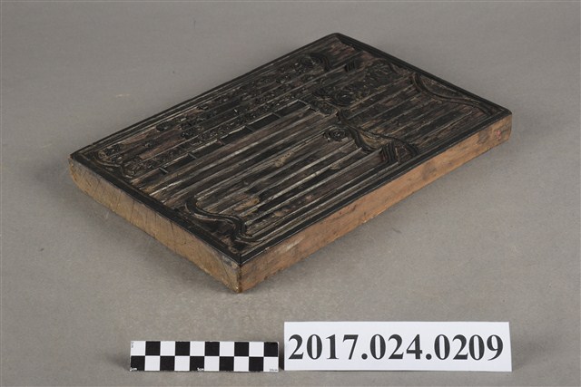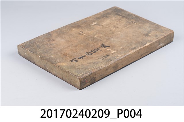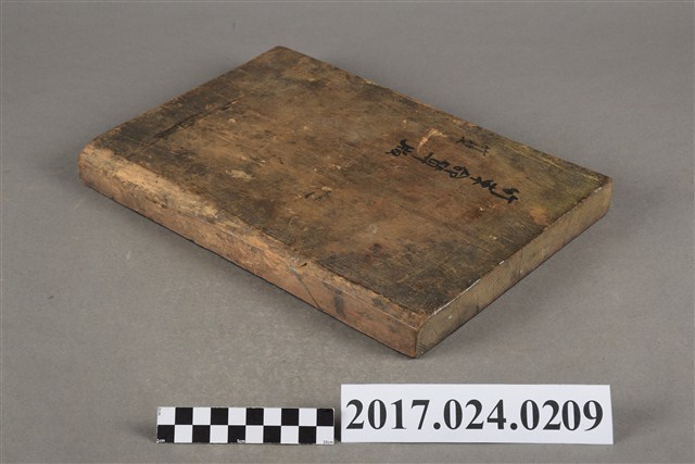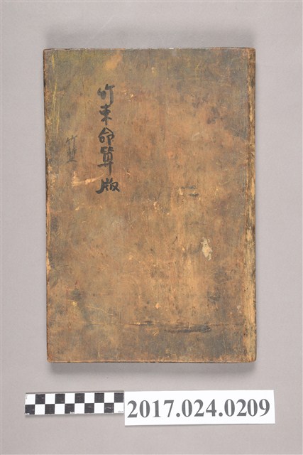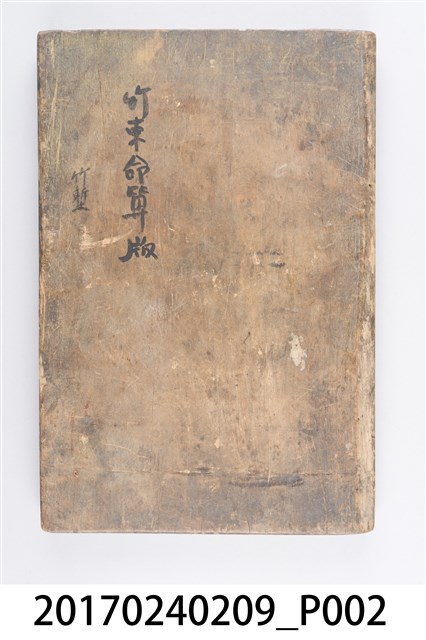 本文物為木頭所雕刻,為竹東算命師所用的算命版,正面寫著太歲年月日等,算命所需的資訊,其圖案樣式則近似竹簡狀,而在其背面寫有「竹東算命版」5字。(撰稿人:曾國棟)