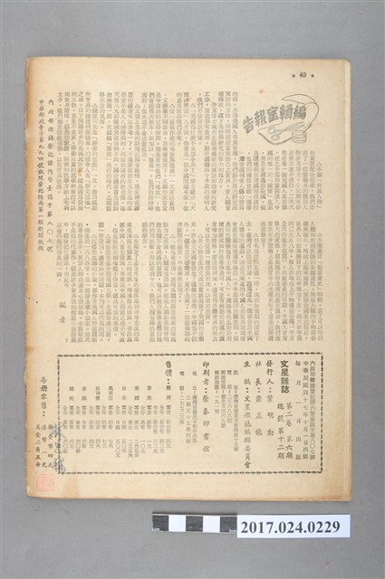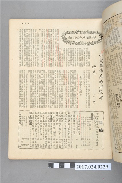 本文物為民國47年(1958年)10月1日出版的文星雜誌第二卷第六期,為總發行的第12期,其封面人物為製造出小兒麻痺症疫苗的沙克(Jonas Edward Salk),其內容除封面人物介紹外,也有國外的藝文欣賞、科學新知、思想、小篇詩集等內容。 文星雜誌為民國46年(1957年)11月5日,由文星書店所發行,發行人為葉明勳,社長則為文星書店創辦人蕭孟能,其發刊詞〈不按牌理出牌〉也展現其理念為「不按常規辦這份雜誌」,其內容以西洋文學翻譯、科普知識、國外思想、學校的介紹,也