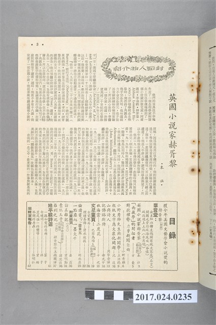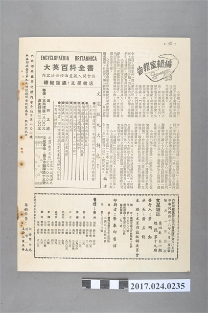 本文物為民國48年(1959年)5月1日出版的文星雜誌第四卷第一期,為總發行的第19期,其封面人物為英國小說家赫胥黎(Aldous Leonard Huxley),其內容除封面人物介紹外,也有國外的藝文欣賞、科學新知、思想、小篇詩集等內容。 文星雜誌為民國46年(1957年)11月5日,由文星書店所發行,發行人為葉明勳,社長則為文星書店創辦人蕭孟能,其發刊詞〈不按牌理出牌〉也展現其理念為「不按常規辦這份雜誌」,其內容以西洋文學翻譯、科普知識、國外思想、學校的介紹,也刊登臺灣