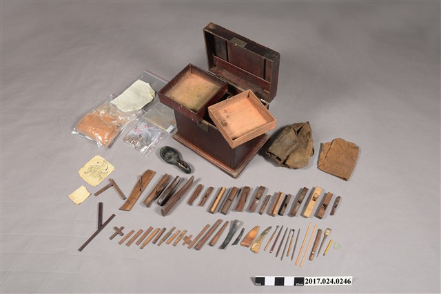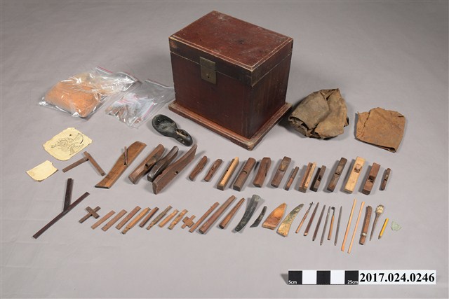 日治時期南投街木匠工具一箱,內含木規17個、鑿刀25支、 刀片7個、壓鐵10個、鋸加鑽7支、銼刀6支、鐵規1支、刨刀20個、 竹筆2支、漆刷12支、畫線刀1支、鑽孔器手把、 墨斗加定規,鉛筆與石筆4件、 草圖2張、小木盒2個、包布2個等。(撰稿人:曾國棟)