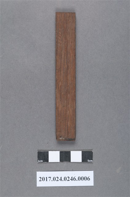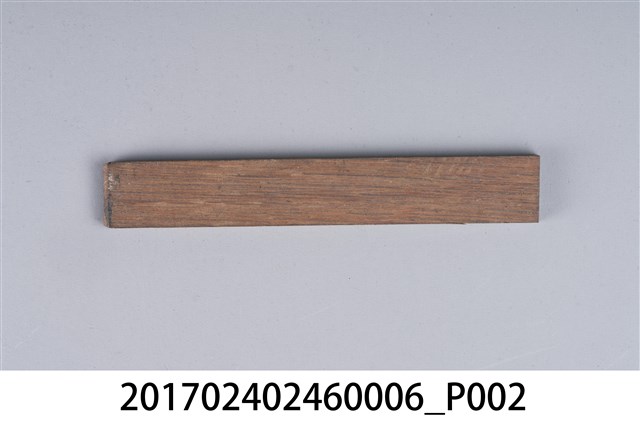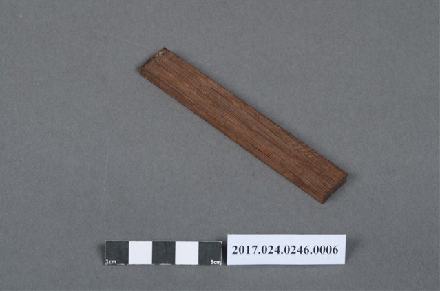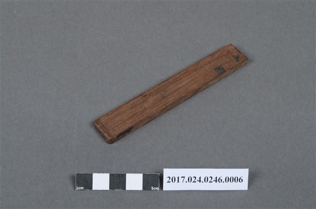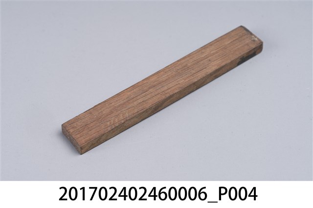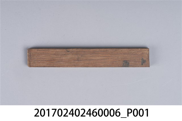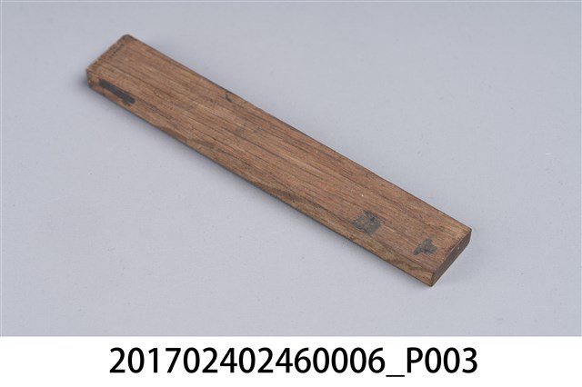 本文物為日治時期南投街木匠工具箱內工具,其形狀為一長條木規,其中一面其邊緣處,有2黑點。(撰稿人:曾國棟)