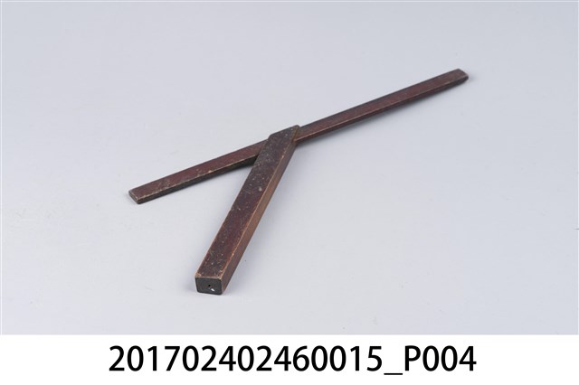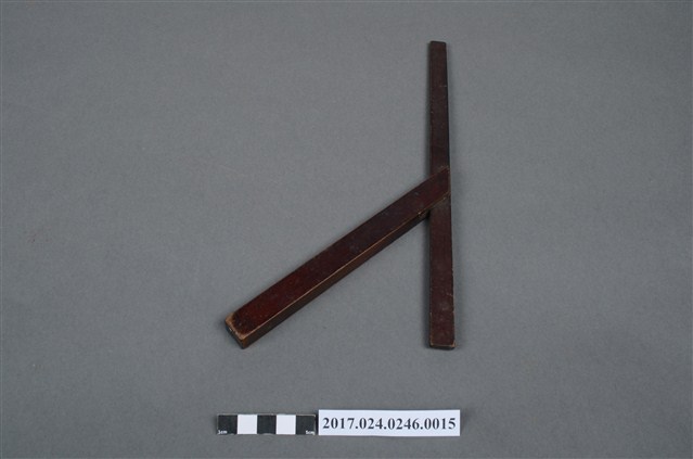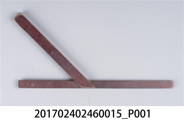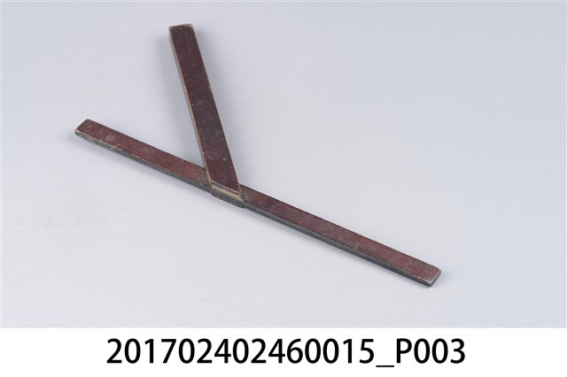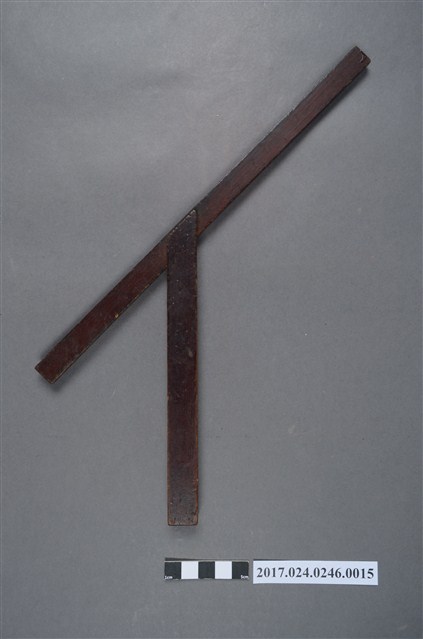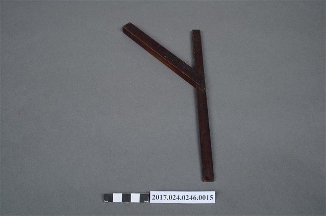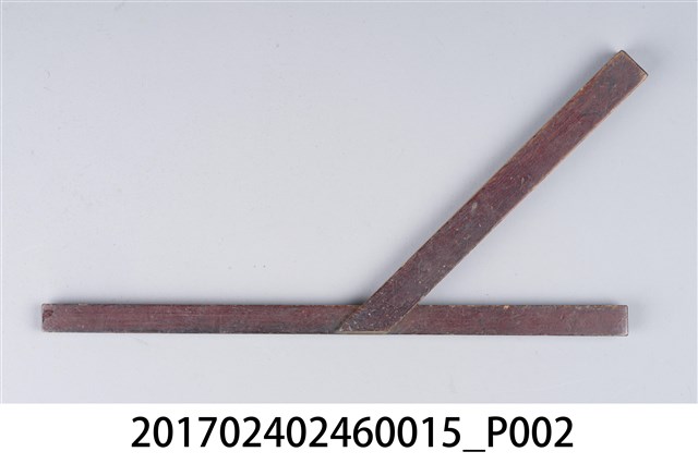 本文物為日治時期南投街木匠工具箱內一件135度與45度木規,用途是測繪工具。(撰稿人:曾國棟)