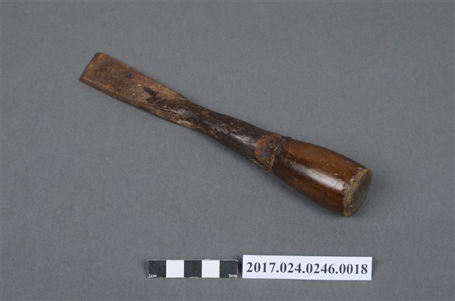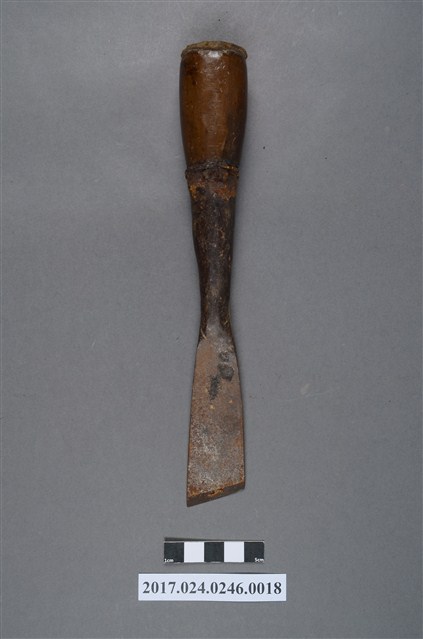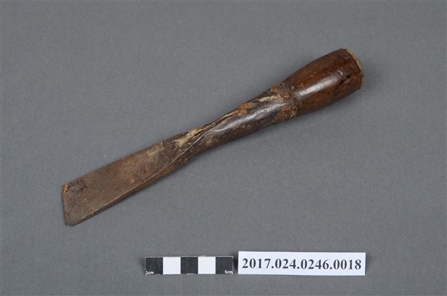 本文物為日治時期南投街木匠工具箱內一件鑿刀,木作的工具,主要是用來鑿榫頭的孔,還有各式修邊的工作。(撰稿人:曾國棟)