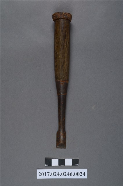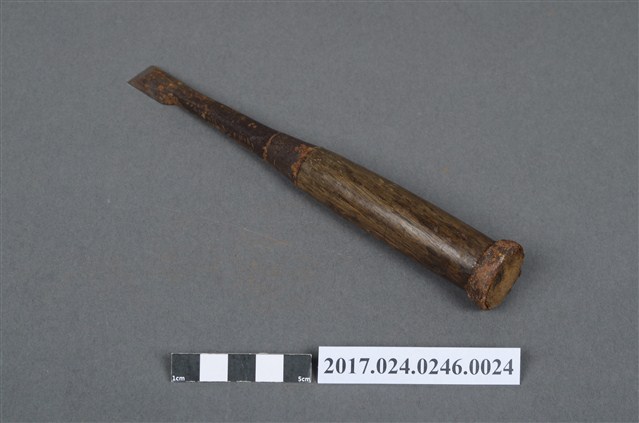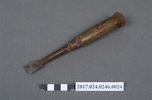 本文物為日治時期南投街木匠工具箱內一件鑿刀,木作的工具,主要是用來鑿榫頭的孔,還有各式修邊的工作。(撰稿人:曾國棟)