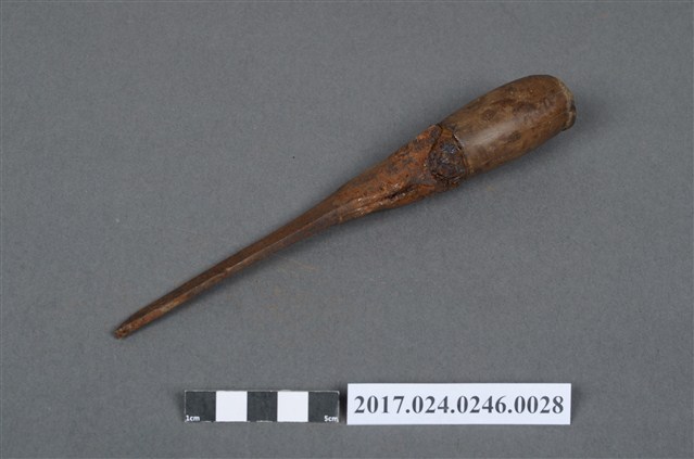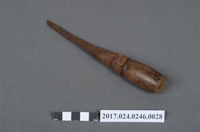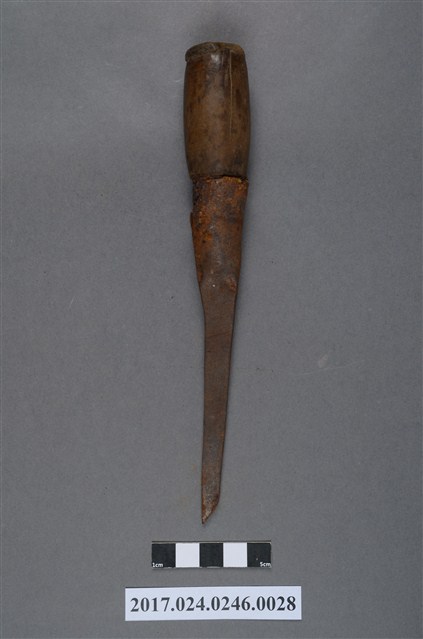 本文物為日治時期南投街木匠工具箱內一件鑿刀,木作的工具,主要是用來鑿榫頭的孔,還有各式修邊的工作。(撰稿人:曾國棟)