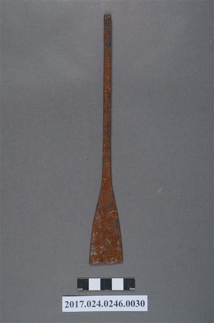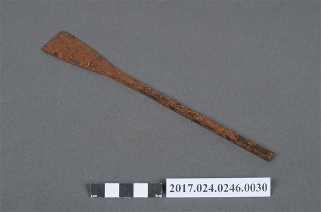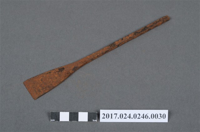 本文物為日治時期南投街木匠工具箱內一件鑿刀,木作的工具,主要是用來鑿榫頭的孔,還有各式修邊的工作。(撰稿人:曾國棟)
