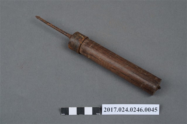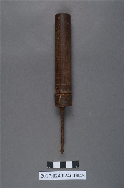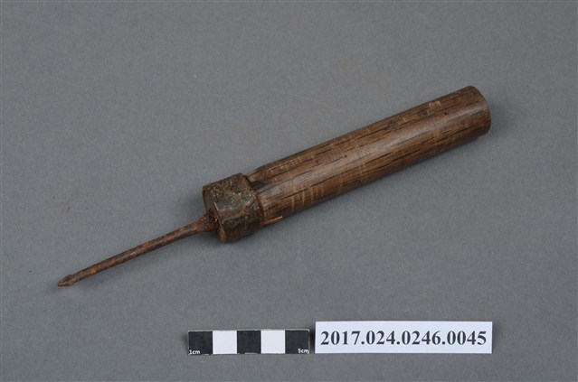 鑽是傳統木工工具之一,為穿孔用的工具。金屬製鑽頭表面有鏽蝕狀況,木製握把有些微磨損痕跡。(撰稿人:曾國棟)