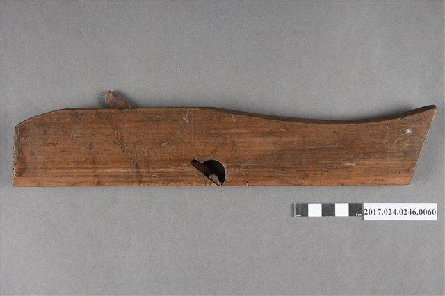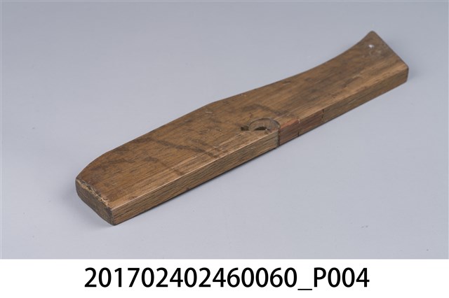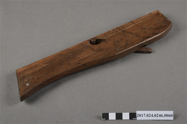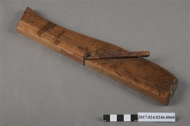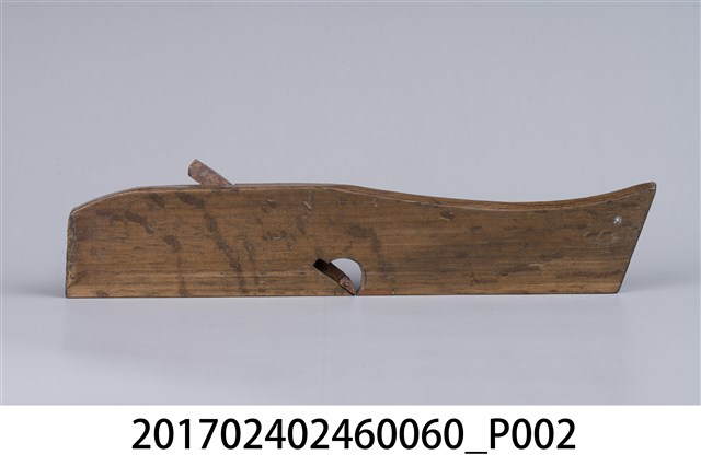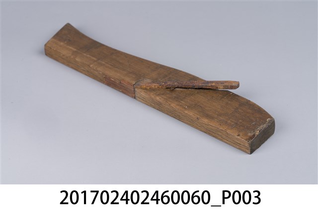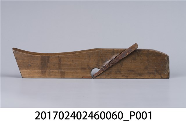 本文物為日治時期南投街木匠工具箱內一件鉋刀,木作的工具,主要是用來鉋平木頭切面,或用以對木頭做小部分的切削。鉋刀由鉋刃和鉋床兩部分構成。鉋刃是金屬鍛制而成的,鉋床是木製的,即將一段鋼質刀刃斜向插入一隻帶方形孔的臺座之中,上用壓鐵壓緊,臺座長條形,左右有手柄,便於手持。(撰稿人:曾國棟)