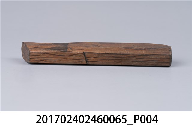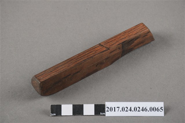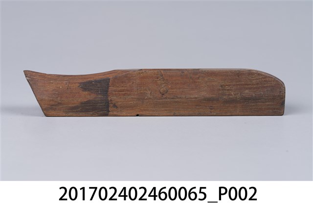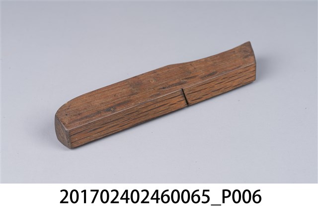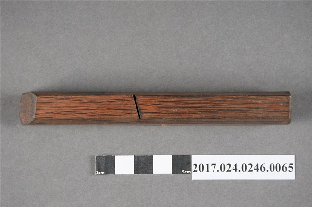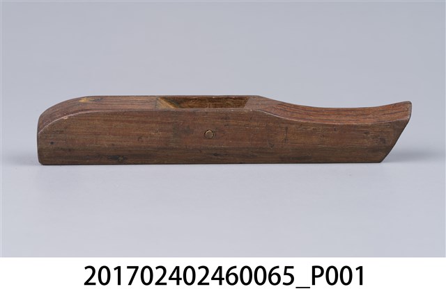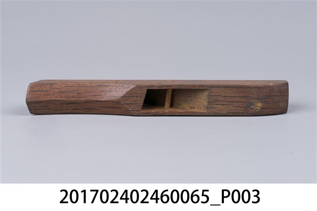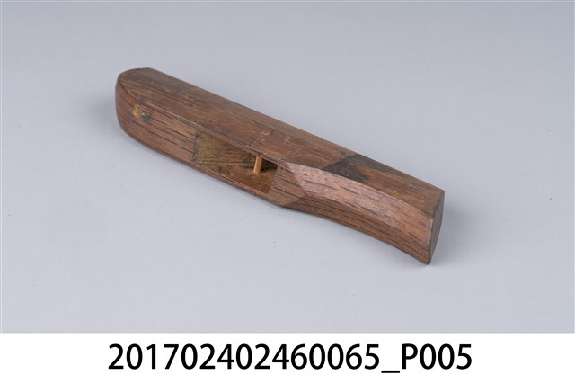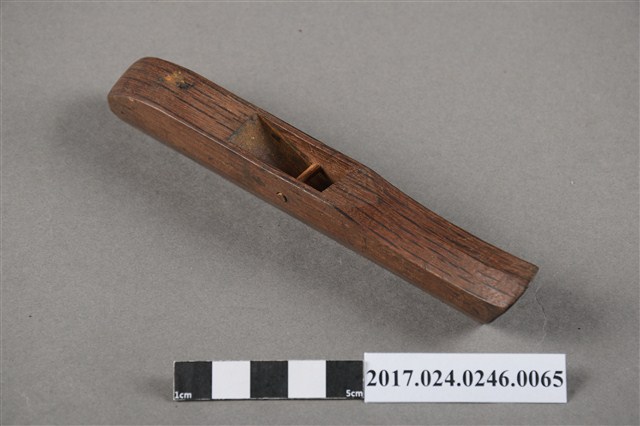 此藏品出自南投街日治木匠工具箱,為一鉋刀。主要用於木材局部形狀之加工。(撰稿人:曾國棟)