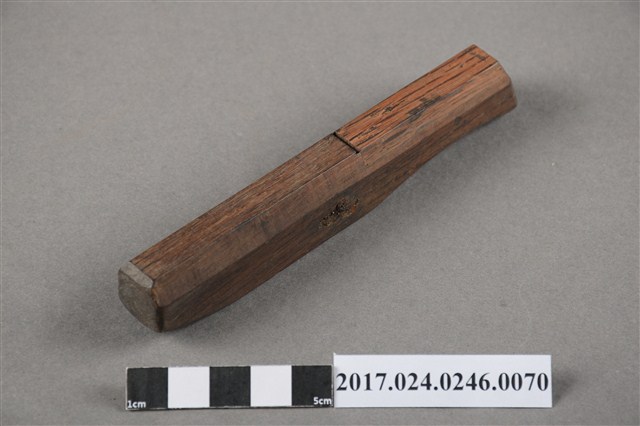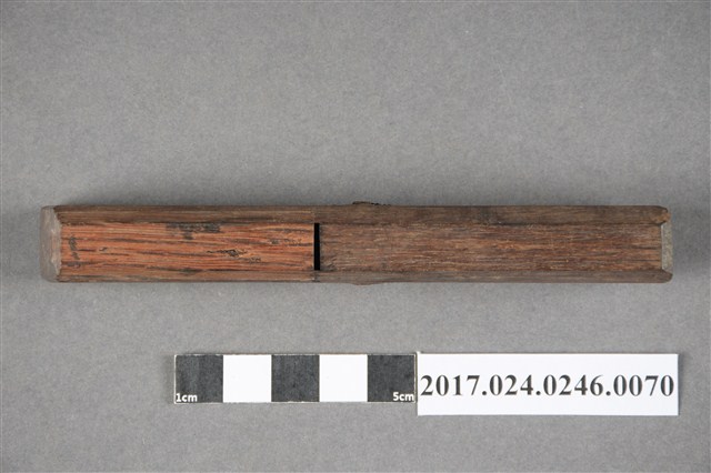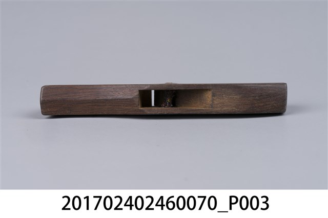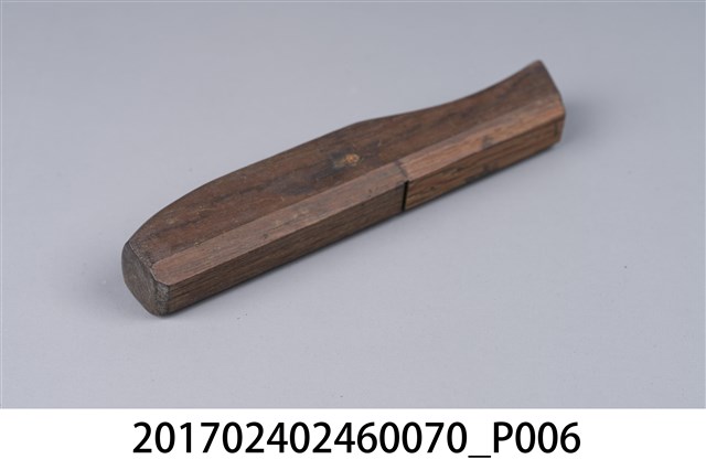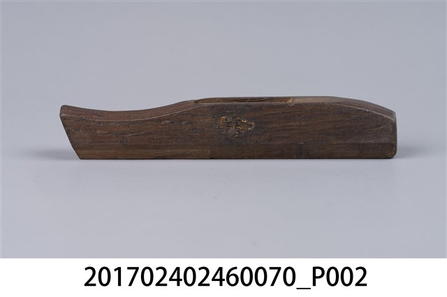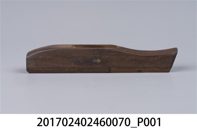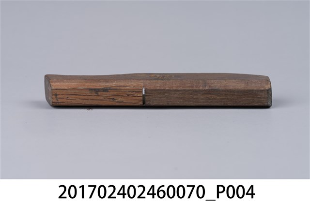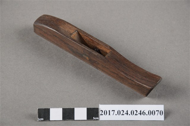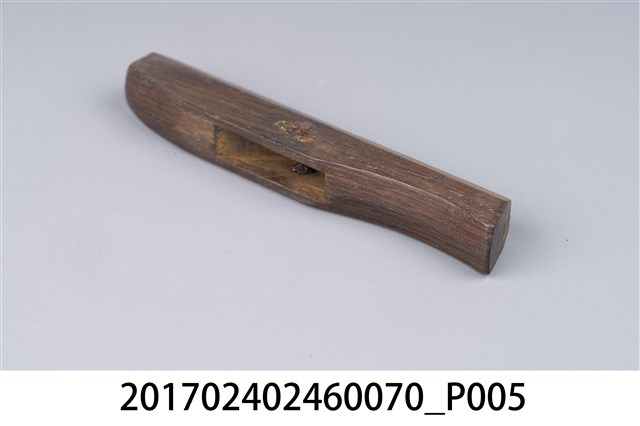 此藏品出自南投街日治木匠工具箱,為一鉋刀。主要用於木材局部形狀之加工。(撰稿人:曾國棟)
