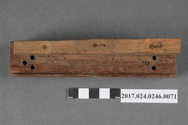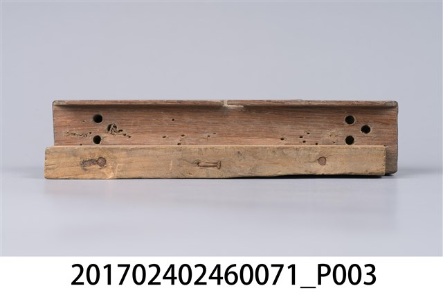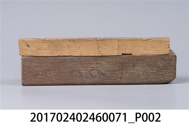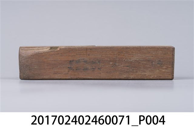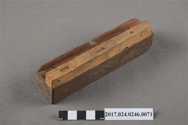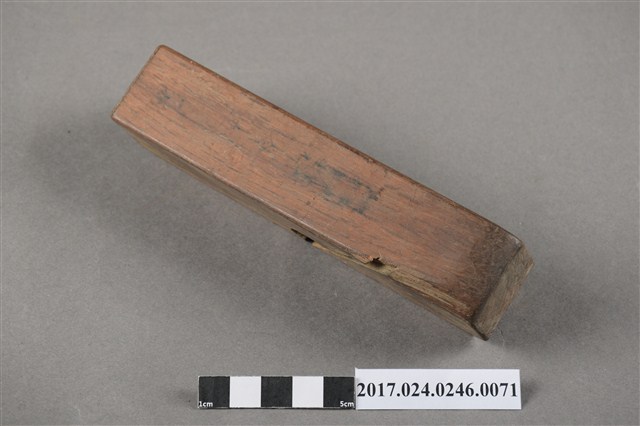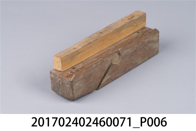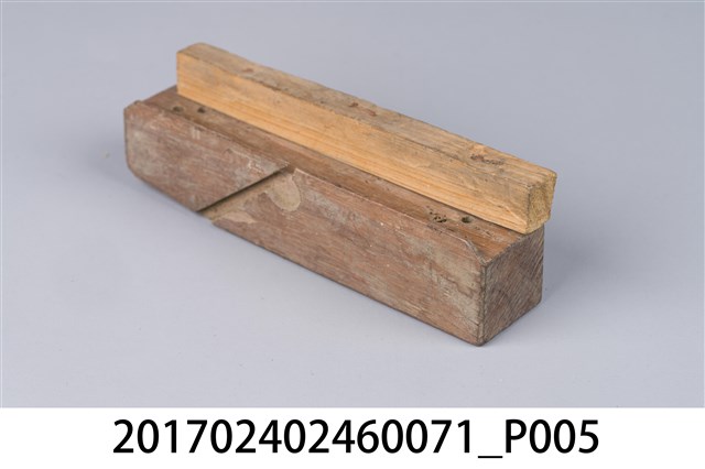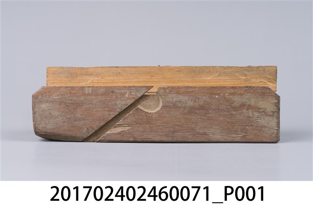 本文物為日治時期南投街木匠工具箱內一件鉋刀,木作的工具,主要是用來鉋平木頭切面,或用以對木頭做小部分的切削。鉋刀由鉋刃和鉋床兩部分構成。鉋刃是金屬鍛制而成的,鉋床是木製的,即將一段鋼質刀刃斜向插入一隻帶方形孔的臺座之中,上用壓鐵壓緊,臺座長條形,左右有手柄,便於手持。(撰稿人:曾國棟)