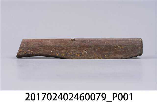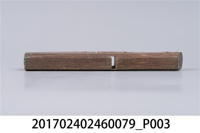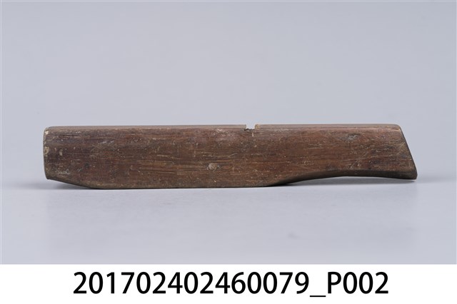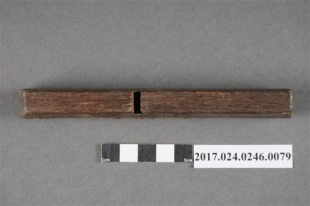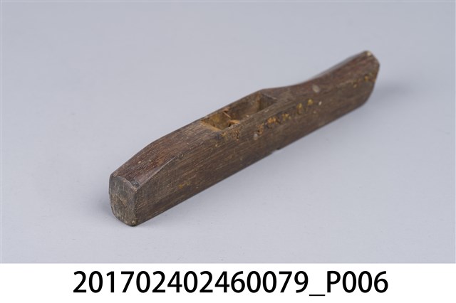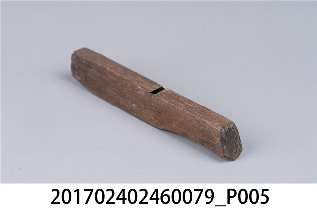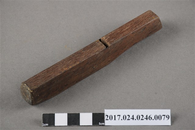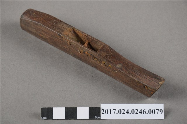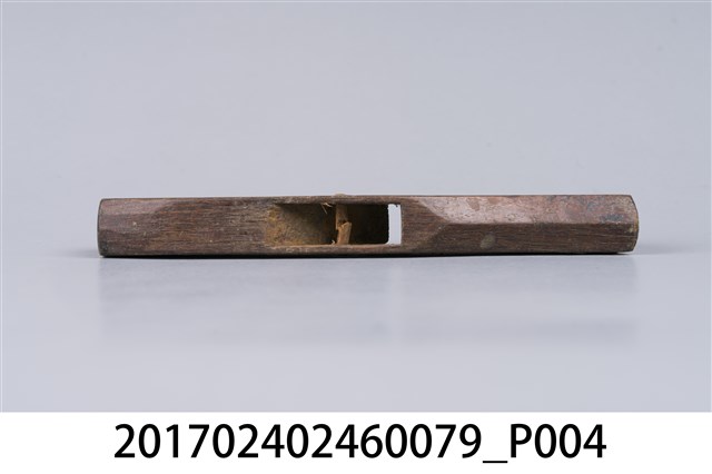 本文物為日治時期南投街木匠工具箱內一件鉋刀,木作的工具,主要是用來鉋平木頭切面,或用以對木頭做小部分的切削。鉋刀由鉋刃和鉋床兩部分構成。鉋刃是金屬鍛制而成的,鉋床是木製的,即將一段鋼質刀刃斜向插入一隻帶方形孔的臺座之中,上用壓鐵壓緊,臺座長條形,左右有手柄,便於手持。(撰稿人:曾國棟)