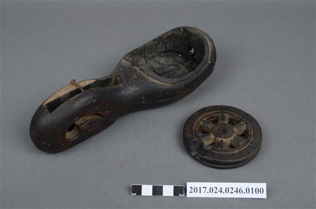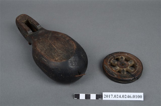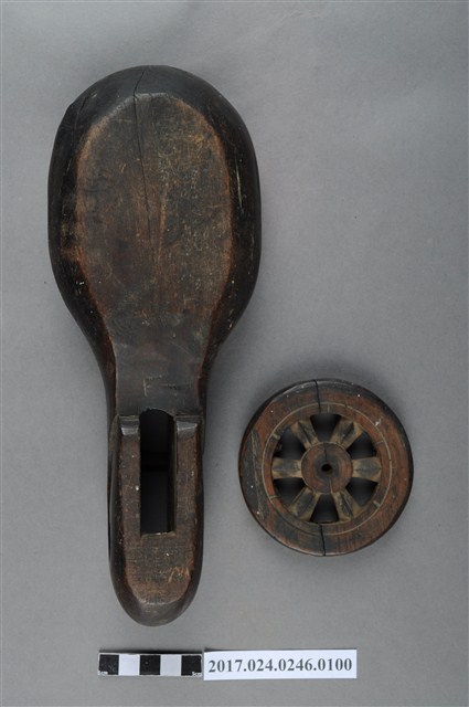 此為日治時期南投街木匠工具箱內容物,為一只墨斗,附有一車輪狀裝飾,盛裝墨水的凹槽久經使用已龜裂,車輪處木頭亦略有損壞。(撰稿人:曾國棟)
