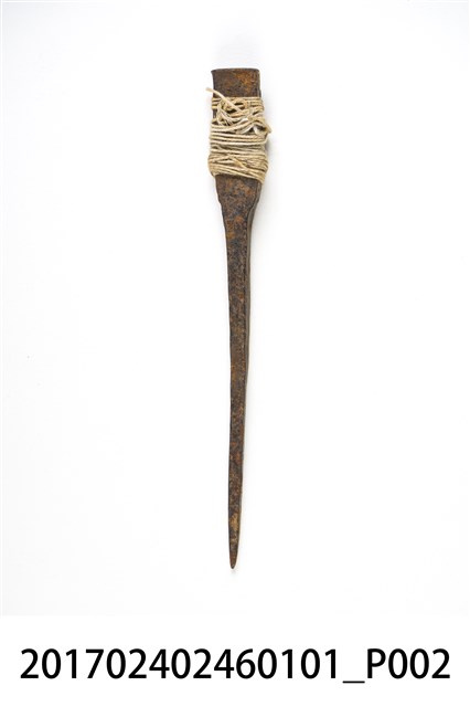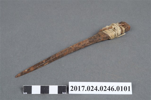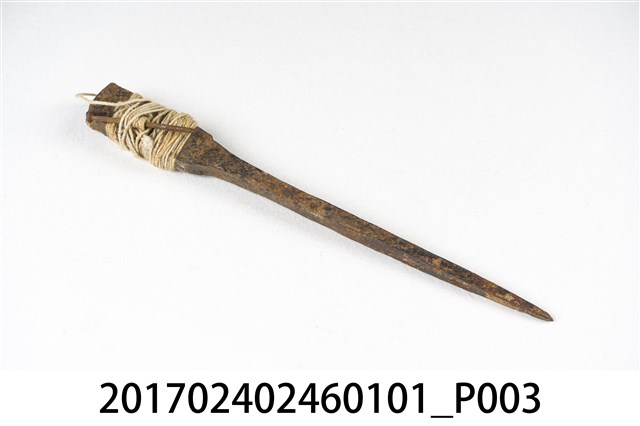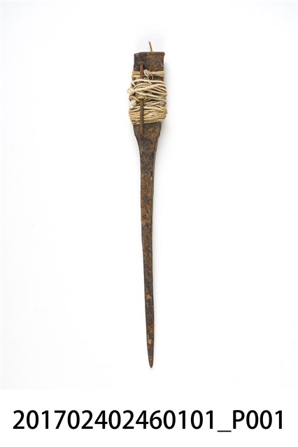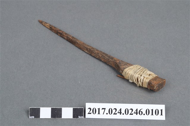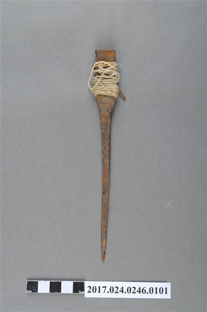 此為日治時期南投街木匠工具箱內容物,為一只墨斗之定規,似為鐵製,略有鏽蝕,上粗下細,並以白線纏繞。(撰稿人:曾國棟)