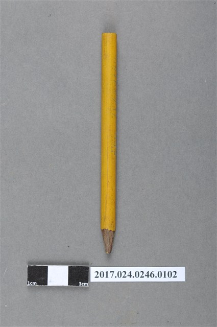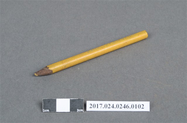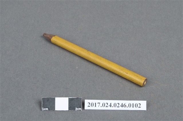 此為日治時期南投街木匠工具箱內容物,為一枝鉛筆,外觀黃色,前端已斷裂,看似有些破舊。(撰稿人:曾國棟)