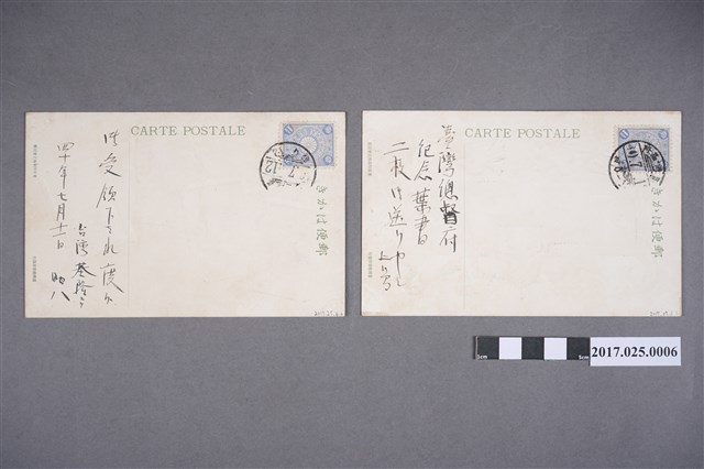2. 明信片皆由東京印刷株式會社製造,臺灣總督府發行。背面印有「CARTE POSTALE」、「郵便はかき」。皆貼有壹錢五厘的郵票及「臺湾基隆 7.12」的郵戳。第一張背面寫有「臺灣總督府紀念葉書二枚」等日文;第二張寫有「台湾基隆四十年七月十一日」等日文。
