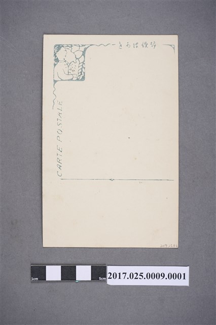 1.此文物是以台北公園內的急公好義坊為主題的明信片,以彩色繪圖呈現。彩繪景緻除了急公好義坊外,還繪製了幾棵樹,左上角寫有「臺北公園內旌寿門」,下寫有小竹。右上角蓋有大正博覽會台灣館紀念章,以兩個三角形上下對稱為圖形。2.明信片背面印刷「郵便はがき CARTE POSTALE」,左上角郵票處為一個人側坐手拿物體,右邊有類似葉子之裝飾。其餘部分皆空白。3.急公好義坊建於清康熙13年(1887),台灣巡撫劉銘傳為了表揚洪騰雲貢生的義行而建置。洪雲騰6歲隨父從福建泉州遷台,居於艋舺地區,成年後考上貢生,且在艋舺當地因從事米郊生意而致富,後因體諒台灣北部考生都必須南下台南府考科舉,所以在1878年捐出土地及金錢建設考棚,供台灣北部考生使用。此義行受劉銘傳請旨建立牌坊來表揚。4.始政四十周年紀念臺灣博覽會於1935年舉辦,日人在臺執政的第四十年,為展示在臺殖民之成果,而舉辦的重大展覽。當中位於台北的展場共分為四大展場,而台灣館位於第二會場,以中國傳統建築構成,其屋頂為歇山重簷式,內部以展出台灣相關內容為主。