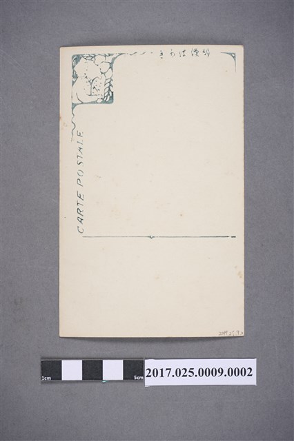 1.此文物是以艋舺龍山寺內的惜字亭為主題的明信片,以彩色繪圖呈現。在右上角寫有「在艋舺龍山寺房惜字亭」,左中位置寫有小竹生。左上角蓋有大正博覽會台灣館紀念章,以兩個三角形上下對稱為圖形。2.明信片背面印刷「郵便はがき CARTE POSTALE」,左上角郵票處為一個人側坐手拿物體,右邊有類似葉子之裝飾。其餘部分皆空白。3.台灣龍山寺共有五處,分別為艋舺、淡水、鹿港、台南,以及鳳山。艋舺龍山寺1740落成,主祀關世音菩薩。惜字亭不同於金爐,是用來燒毀書及紙張的地方,是古代文人雅士「敬惜字紙」的方式。4.始政四十周年紀念臺灣博覽會於1935年舉辦,日人在臺執政的第四十年,為展示在臺殖民之成果,而舉辦的重大展覽。當中位於台北的展場共分為四大展場,而台灣館位於第二會場,以中國傳統建築構成,其屋頂為歇山重簷式,內部以展出台灣相關內容為主。