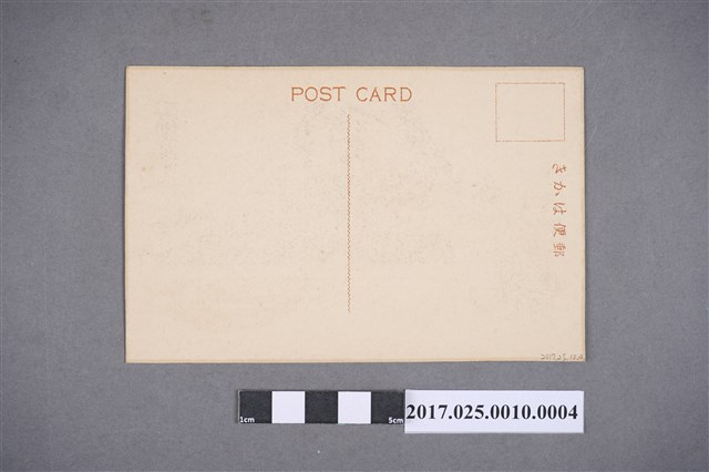 1.此文物是製糖會社內部的黑白明信片,明信片右上大張照片為建築內部,中間有一木架,左右兩邊擺有桌子,上有擺設物品,右邊桌上有六個圓柱狀體,後方有畫架,而左方則是較小型的擺飾。明信片左下小張照片場景有一門窗,旁擺設三根由小至大的長棍,牆上還寫有淡淡的「迎奉」兩字。兩張照片中的畫面都貼有長形紙條。另外,左上角寫有直式「行啟記念館 內部」,右下方則有橫向註明「台灣製糖株式會社」。2.明信片背面印刷「郵便はがきPOST CARD」,左上角為貼郵票處,中央有一橫線,其餘部分皆空白。保存方面,空白處有些黑印。3.台灣總督兒玉源太郎在台發展,以農業為其施政重點之一,當時任用農學博士新渡戶稻,其提出「糖業改良意見書」,提出在台糖業改良之方法,總督及長官接採納,並決定先在臺灣成立一間大規模的新式製糖會社。明治三十四年(1901),臺灣製糖株式會社開始在臺南廳橋仔頭建廠,而後陸陸續續設置了阿緱製糖所、後壁林製糖所、灣裡製糖所、車路墘製糖所、三崁店製糖所、埔里製糖所、臺北製糖所、東港製糖所、旗尾製糖所、恆春製糖所、大寮製糖所。