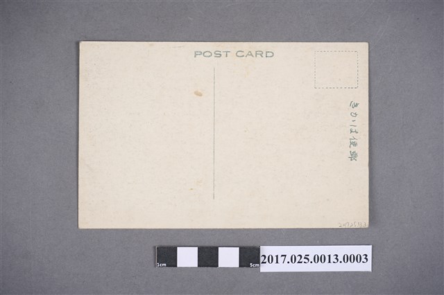 1. 本文物為烏來蕃女織布明信片,也就是攝有烏來女生織布樣貌的明信片,前面為黑白照片,其中間部分為烏來當地原住民的女人,其穿著傳統服飾,使用傳統的織布工具進行織布工作;烏來原住民女人周為皆是當地以竹子搭建而成的傳統建築。此明信片的右下角用黑色日文字體寫有(台灣)烏來蕃女織布,且有WEAVING BY SAVAGE WOMEN FORMOSA。背面則是寫有郵政明信片和POST CARD等明信片的標記,還有貼郵票的方框。2. 明信片也就是現在的明信片,起源於1864年英國女皇伉儷印刷之繪圖聖誕卡,並以郵遞的方式政贈親友,因此掀起了私人卡片寄送的風潮;而第一張由國家之名所發行的官方明信片為1969年由奧地利郵政局所發明,並以其作為一種不具保密性的信件,由於其郵資較一般信件低廉,因此廣受一般名眾歡迎。日本於明治維新(1868年)以後,由於西方政策的推行,因此效仿西房的郵遞政策,也開始製作官方明信片稱為「葉書」,若在葉書上面放置「寫真作品」和繪畫等就稱為「明信片」。另外,在1900年之前明信片的印製和上面的寫真內容都受到官方霸權的影響,直到1900年之後才有私人明信片的出現。3. 寫真一詞就是攝影、照片之意,寫真為台灣開港通商後,由攝影者引進,其大多為傳教士、旅行家、自然學者、領事或海關職員。日治時期日治時期的寫真帖出版者,多為總督府所屬機關,或為民間寫真館,其攝影者多以日人為主。攝影內容包含全島著名之山川、城市、廳廨、廟寺、人物、物產、工業、人文活動、風俗民情等。攝影目的有學術研究、活動宣傳、人物紀念、戰事紀錄、風景紀錄、建設成果等,而殖民政府把其印製在明信片上面廣為發行,多有頌揚功績、彰顯殖民成果的意涵。