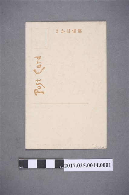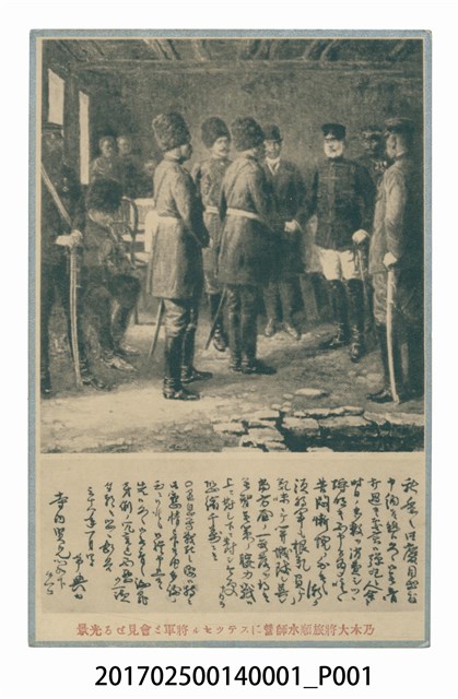 1. 本文物為乃木大將與旅順水師營畫像的美術明信片,前面為黑白圖像,其繪畫主題說明乃木希典將軍閱見旅順水師的樣貌,將軍著正式軍裝,一手握佩刀一手與管理水師的長官握手,相貌莊嚴。畫像中乃木將軍後面站有一名穿著西裝,戴高帽的男子;而其四周皆為著軍裝戴厚毛軍帽的軍人,各個都抬頭挺胸,左手握佩刀。而明信片下方以日文草書寫了有關於乃木將軍和旅順水師見面的內容,最下方以黑色日文之字體寫有乃木大將旅順水師見面光景。背面寫有郵政明信片和POST CARD等明信片的標記,還有貼郵票的方框。2. 明信片也就是現在的明信片,起源於1864年英國女皇伉儷印刷之繪圖聖誕卡,並以郵遞的方式政贈親友,因此掀起了私人卡片寄送的風潮;而第一張由國家之名所發行的官方明信片為1969年由奧地利郵政局所發明,並以其作為一種不具保密性的信件,由於其郵資較一般信件低廉,因此廣受一般名眾歡迎。日本於明治維新(1868年)以後,由於西方政策的推行,因此效仿西房的郵遞政策,也開始製作官方明信片稱為「葉書」,若在葉書上面放置「寫真作品」和繪畫等就稱為「明信片」。另外,在1900年之前明信片的印製和上面的寫真內容都受到官方霸權的影響,直到1900年之後才有私人明信片的出現。3. 明信片的圖片來源主要有三,其一是取自於寫真也就是當時的照片,其來源多來自人類學家或相關研究學者所攝之照片,多以原住民為題材;其二,由當時名畫家所繪製之美術作品所構成,內容多為風景畫、美展作品、歷史事件、人物像等,也被稱為美術明信片;其三為官方或博覽會之宣傳海報。不論是哪一種的設計方式,都表現了台灣美術的區域特色,但也可以從當時的題材看出當時的官方力量的強大,以及殖民意象在明信片上的體現。