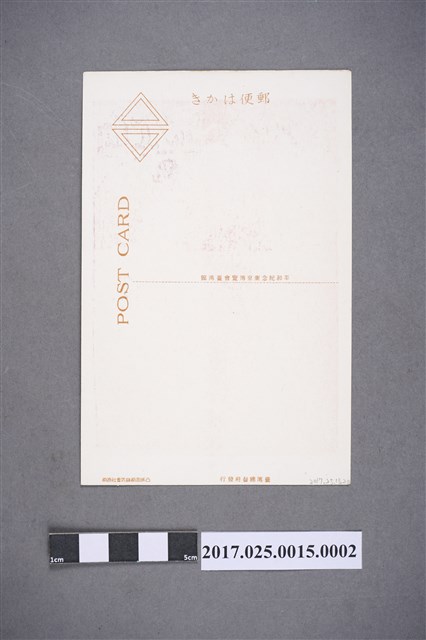 1. 本文物為台灣糖米上升明信片,前面為彩色圖像,其繪畫構圖以海島上的台灣為主,台灣島上還站有一名穿著白色衣服的女人,其背對畫面,並且雙手各拿一隻號角,做吹奏姿。而台灣島上寫有幾行字說明台灣的名物為砂糖、樟腦、米以及滿山的黃金花。此畫將時間設定為黃昏,因此黃昏的海上有一顆昏紅的夕陽,其餘輝還印在台灣之上。畫面最上方以紅色日文寫著:台灣產業上升。最下方以黑色日文之字體寫有台灣宣傳海報明信片。背面寫有郵政明信片和POST CARD等明信片的標記,還有貼郵票的方框。2. 明信片也就是現在的明信片,起源於1864年英國女皇伉儷印刷之繪圖聖誕卡,並以郵遞的方式政贈親友,因此掀起了私人卡片寄送的風潮;而第一張由國家之名所發行的官方明信片為1969年由奧地利郵政局所發明,並以其作為一種不具保密性的信件,由於其郵資較一般信件低廉,因此廣受一般名眾歡迎。日本於明治維新(1868年)以後,由於西方政策的推行,因此效仿西房的郵遞政策,也開始製作官方明信片稱為「葉書」,若在葉書上面放置「寫真作品」和繪畫等就稱為「明信片」。另外,在1900年之前明信片的印製和上面的寫真內容都受到官方霸權的影響,直到1900年之後才有私人明信片的出現。3. 明信片的圖片來源主要有三,其一是取自於寫真也就是當時的照片,其來源多來自人類學家或相關研究學者所攝之照片,多以原住民為題材;其二,由當時名畫家所繪製之美術作品所構成,內容多為風景畫、美展作品、歷史事件、人物像等,也被稱為美術明信片;其三為官方或博覽會之宣傳海報。不論是哪一種的設計方式,都表現了台灣美術的區域特色,但也可以從當時的題材看出當時的官方力量的強大,以及殖民意象在明信片上的體現。