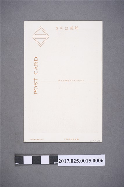 1. 本文物為來到南方天惠地之美術明信片,前面為彩色圖像,其繪畫構圖以綠色坡地為基底,圖的中央有一隻灰色水牛,水牛上方坐著一名裸體的男子,右手舉高有如打招呼一般。牛隻下方所踩的土地為朱紅色,並有顏色對比的綠色草叢,而紅色土地上方則是一片又一片的綠色坡地,遠處還有建好的樓房剪影。另外,值得注意的是,畫面右邊有木瓜樹、鳳梨等富有台灣風味的水果。畫面上方以斗大白色日文寫著:來到南方天惠地。而明信片最下方以黑色日文之字體寫有台灣宣傳海報明信片。背面寫有郵政明信片和POST CARD等明信片的標記,還有貼郵票的方框。2. 明信片也就是現在的明信片,起源於1864年英國女皇伉儷印刷之繪圖聖誕卡,並以郵遞的方式政贈親友,因此掀起了私人卡片寄送的風潮;而第一張由國家之名所發行的官方明信片為1969年由奧地利郵政局所發明,並以其作為一種不具保密性的信件,由於其郵資較一般信件低廉,因此廣受一般名眾歡迎。日本於明治維新(1868年)以後,由於西方政策的推行,因此效仿西房的郵遞政策,也開始製作官方明信片稱為「葉書」,若在葉書上面放置「寫真作品」和繪畫等就稱為「明信片」。另外,在1900年之前明信片的印製和上面的寫真內容都受到官方霸權的影響,直到1900年之後才有私人明信片的出現。3. 明信片的圖片來源主要有三,其一是取自於寫真也就是當時的照片,其來源多來自人類學家或相關研究學者所攝之照片,多以原住民為題材;其二,由當時名畫家所繪製之美術作品所構成,內容多為風景畫、美展作品、歷史事件、人物像等,也被稱為美術明信片;其三為官方或博覽會之宣傳海報。不論是哪一種的設計方式,都表現了台灣美術的區域特色,但也可以從當時的題材看出當時的官方力量的強大,以及殖民意象在明信片上的體現。