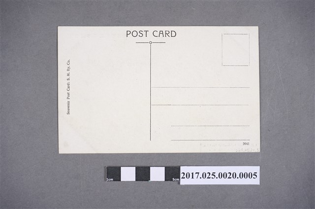 此文物正面右上方印有「滿鐵安奉線滿洲耶馬溪」,左下方貼著一個標籤上方印有「A view along Antung-Mukden Line,South Manchuria Railway」畫面左邊有山壁,左下方有幾個人站立在那邊,畫面中間有溪流且溪上有一座橋,遠處一點可看到山景;背面的左邊印有「Souvenir Post Card : S. M. Ry. Co.」,正上方印有「POST CARD」,右上角為貼郵票之處,中間有一條黑線,右半邊也印有幾條虛線。 日俄戰爭後,中國東北被日本占領,原來由沙俄修建的中東鐵路長春至旅順段被轉讓給日本,改稱為南滿鐵路。為管理鐵道,1906年6月7日,以天皇的名義發布第142號飭令,公布了《南滿洲鐵道株式會社成立之件》,11月26日在東京正式成立南滿洲鐵道株式會社,首任總裁為後藤新平。1907年,會社總部從東京遷往大連。 滿鐵經營南滿鐵路初期的線路編排,分為:大連本社、南滿鐵路南段及營口線、南滿鐵路北段、安奉線及撫順線等四部分。安奉鐵路是日本在日俄戰爭期間,藉口戰時軍運的需要,強築的輕便鐵路。