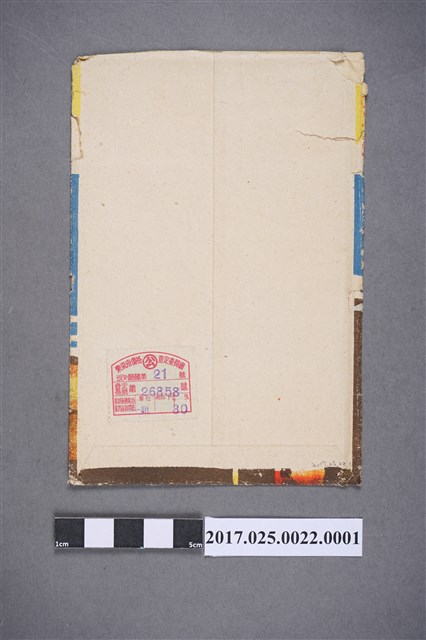 此文物正面印著「台灣 第三集」畫面呈現達悟族的漁船及一個穿著傳統服飾的達悟族人在沙灘上,背景是一片藍色的海;背面有個標籤上面印著「東京府價格查定委員會 公定ヌハ規格番號第21號 查定番號第26858號 最終販賣業者最高販賣價格 單位一組 30ぎ」。